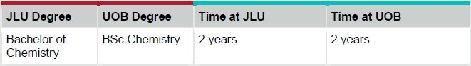This pathway is known as the UOB-JLU 2+2 Global Transfer Programme (Chemistry). After completing the programme, you will receive a bachelor’s degree Jilin University and an bachelor’s degree degree from the University of Bristol.