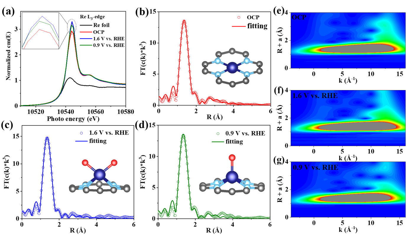在此,管景奇研究团队在N掺杂的石墨烯上制备了具有ReN4位点的单原子铼催化剂(Re-NG),它具有卓越的ORR催化能力,半波电位为0.86 V,并具有出色的OER活性,过电位较低(η10= 368 mV)。此外,Re-NG在可充电ZAB阴极上的表现也令人满意,电池电压高达1.53V,比容量接近理论值,高达828.7 mA h gZn−1,并且具有出色的循环稳定性。原位XAS表征和理论模拟揭示了Re-NG在不同反应电位下的结构演变,形成了不同的活性位点(ReN4-O/Re-N4-2O),有效而稳定地催化了反应,从而加速了ORR/OER动力学,实现了高活性。该研究清楚地阐明了Re-NG高效催化氧电极反应的机理,为尚未知晓的单原子氧催化剂的催化机理提供了有价值的参考。相关研究成果发表在CCS Chemistry杂志。