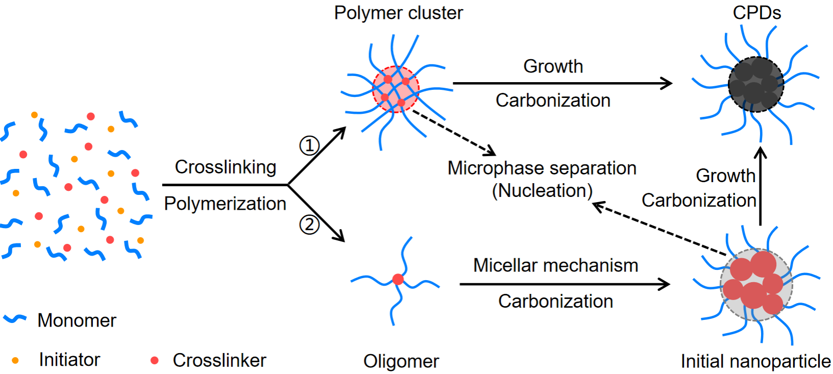 针对上述问题,杨柏课题组基于实验数据和理论模拟深入探究了CPDs的形成过程,提出了交联诱导成核碳化(crosslinking-induced nucleation and carbonization, CINC)的形成机制。具体通过改变反应体系中交联剂的含量以改变交联度,详细研究了交联度对CPDs的尺寸、结构和性能的影响。发现没有交联无法形成CPDs,随着交联度的增加,得到了尺寸更大、碳化程度更高的CPDs。根据实验结果,揭示了CPDs的形成过程主要通过两条路线,在两条路线中,交联诱导的微相分离是CPDs粒子成核和形成的关键。形成的微相区更加疏水,使基团间距离更近以增加反应几率,从而促进CPDs的形成及碳化。通过耗散力子动力学模拟分析也验证了交联诱导微相分离的关键假设。此外,通过数学建模和实验相结合,揭示了前驱体的亲疏水性对CPDs尺寸的影响规律。使用更疏水的前驱体会因为微相分离尺度更大而得到更大尺寸的CPDs。这项工作阐明了CPDs的形成机制,为CPDs的结构和性能调控提供了更多的理论支持,尤其是对CPDs尺寸可控的合成。该研究也表明,CPDs的水热合成是一种新的聚合方法,不同于过去用于制备纳米粒子的聚合方法,其中交联和碳化至关重要。相关研究成果以“Very Important Paper”形式发表在Angew. Chem. Int. Ed.杂志(Angew. Chem. Int. Ed.2024, 63, e202410519)。