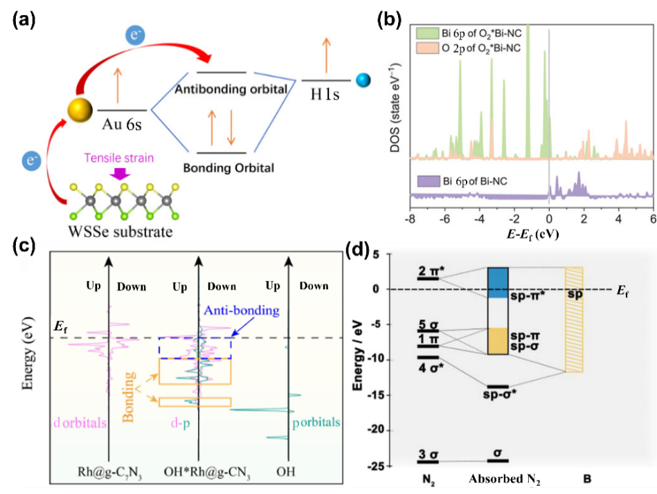 首先,介绍了Sabatier原理和与过渡金属催化相关的d轨道理论,分析了催化中过渡金属与被吸附物的轨道杂化过程,从过渡金属的种类和配位环境两方面总结了对过渡金属d带中心的影响,进而影响被吸附物与过渡金属的轨道杂化的有效程度,最终影响反应的吸附能和催化效果。同时,主要介绍了分波态密度(PDOS)、分子轨道、晶体轨道汉密尔顿群(COHP)和电荷密度差四种常见的轨道杂化描述符,定量直观地描述轨道杂化,对轨道杂化进行清晰有力的阐述,从而有助于从微观层面深入理解和分析SACs的催化活性和催化机理。