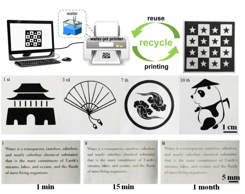 无墨喷水打印技术是以水代墨实现打印的技术,核心技术是打印纸,它具有水致变色可重复擦写性质,从而实现了纸张的循环使用。