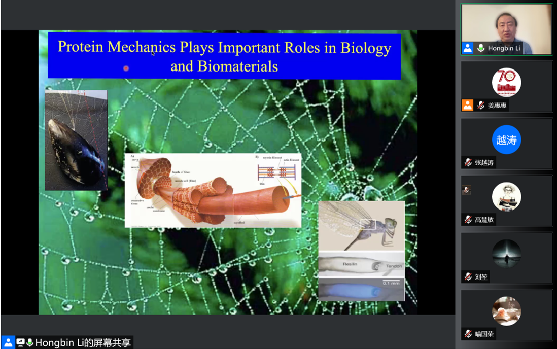 6月2日上午,加拿大不列颠哥伦比亚大学教授李宏斌应邀线上做客“吉大化学七十年——科学与未来系列讲座”,以“蛋白质力学:从单分子力谱到生物材料构建”为题,为学院师生作学术报告。
