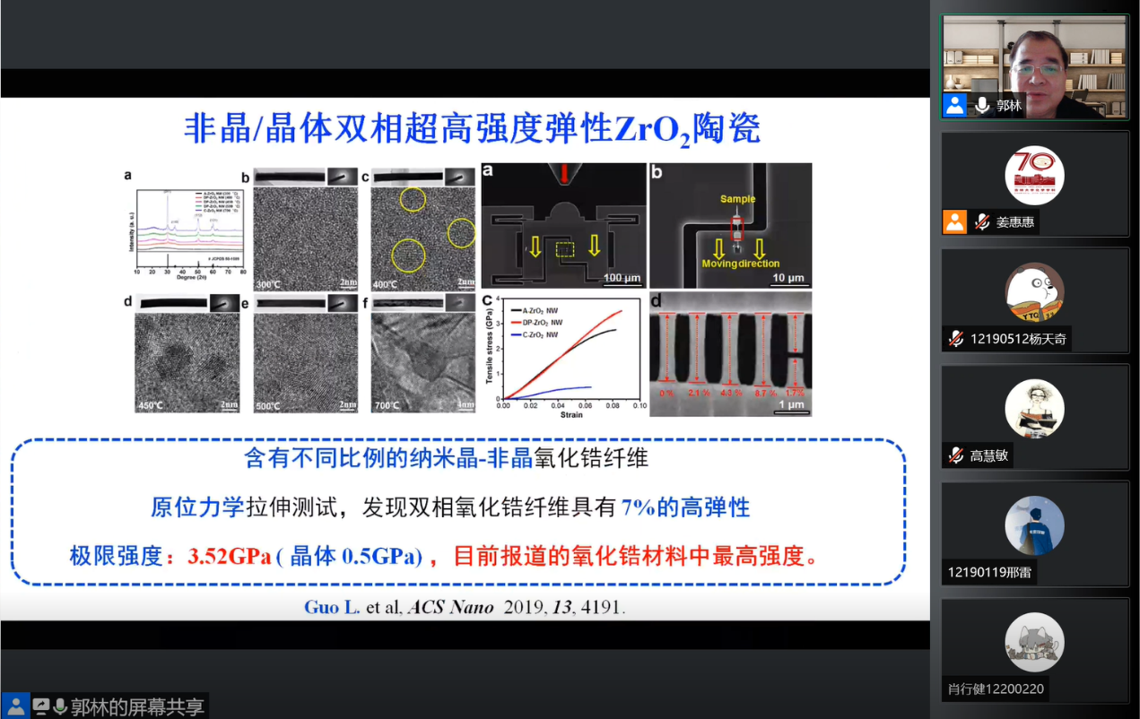 讲座中,郭林教授围绕无机非晶微纳米材料的可控合成及相关特性深入浅出地分享了其课题组在非晶微纳米材料普适制备方法,无机非晶微纳米材料光学特性、催化特性,非晶微纳米材料的力学特性及其在牙修复中的应用等方面的研究进展,展现了无机非晶微纳米材料的研究前沿及广阔的应用前景。在交流互动环节,郭林教授耐心详细地解答了院内外师生的问题,并对相关领域的发展出了展望。ACG港湾