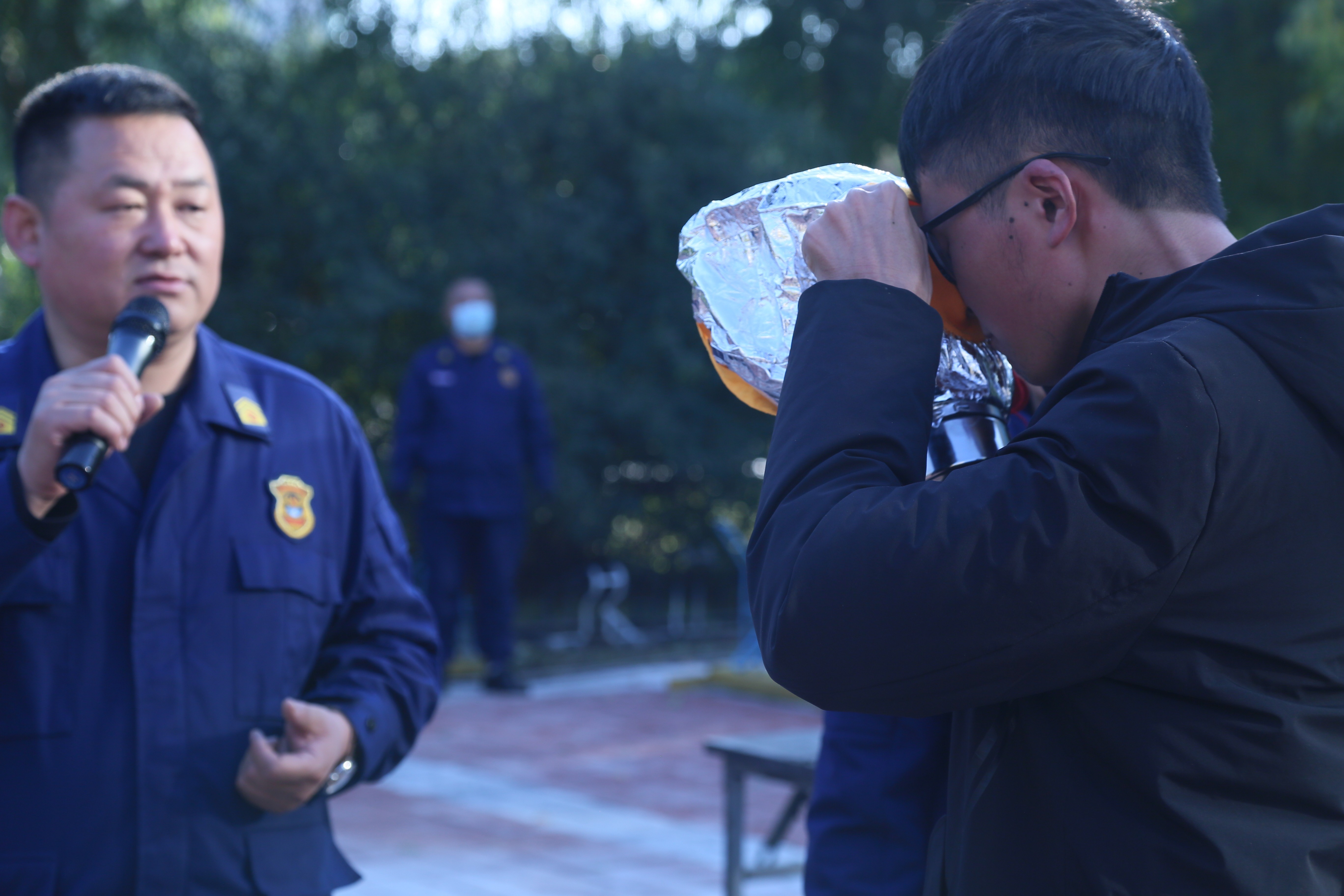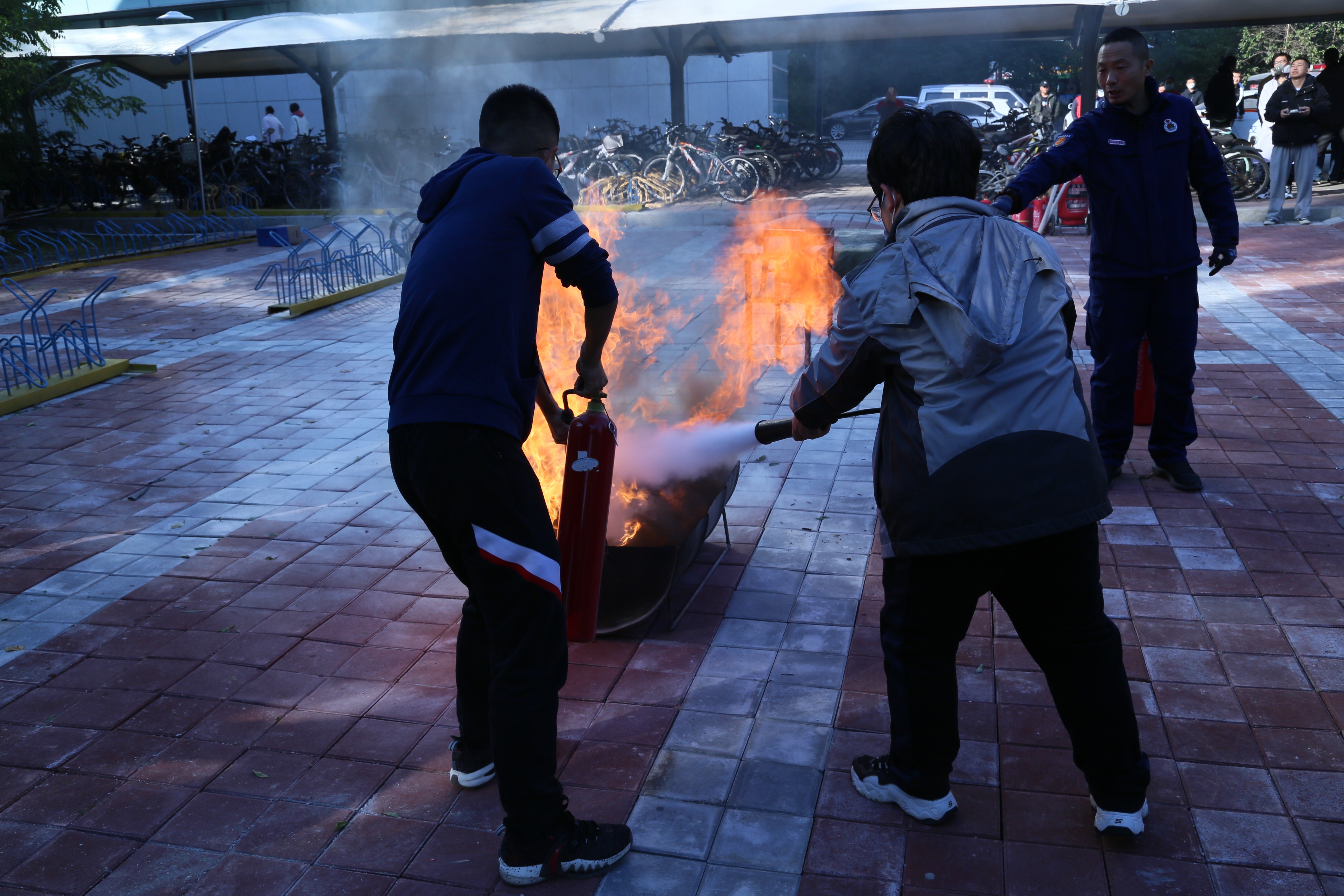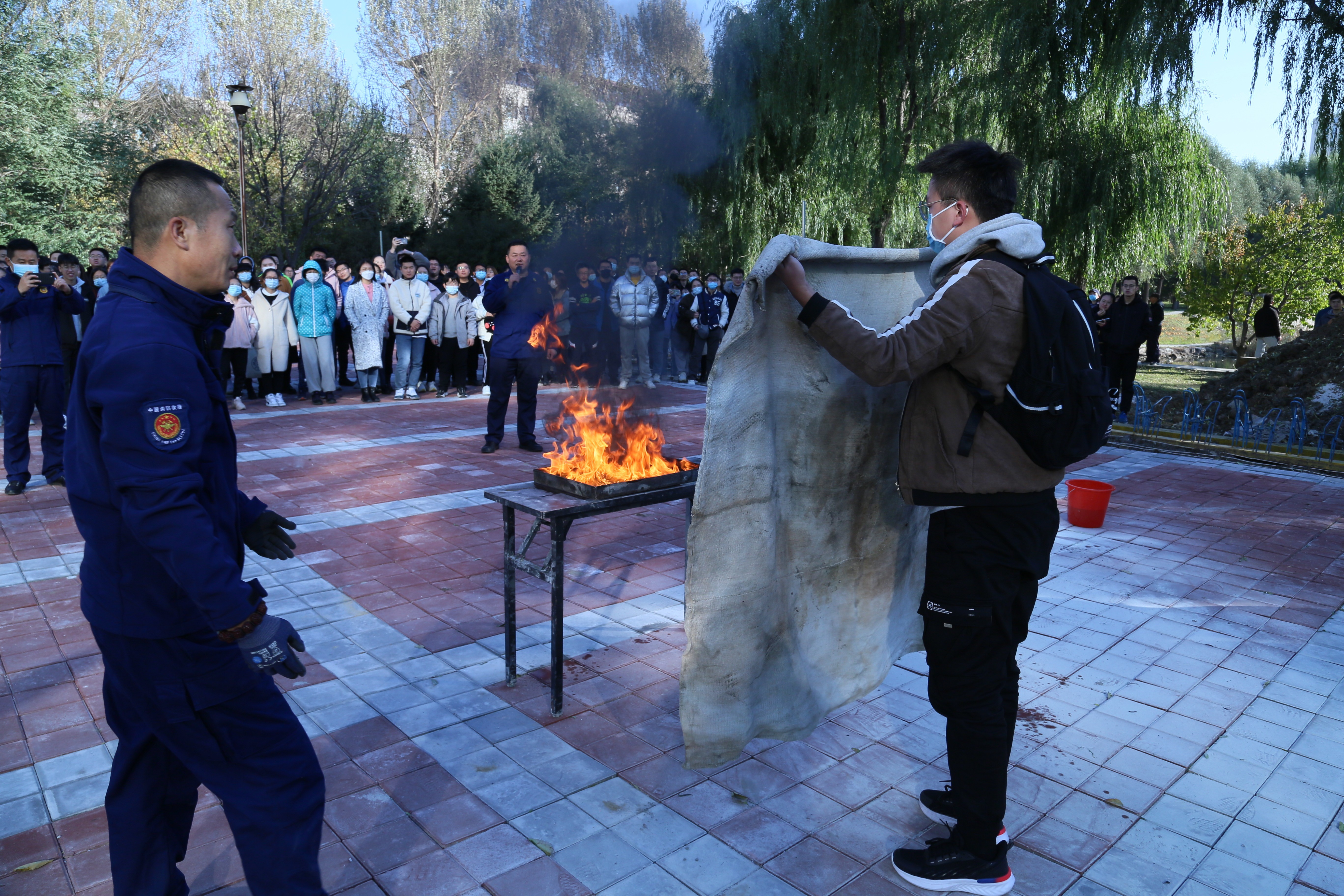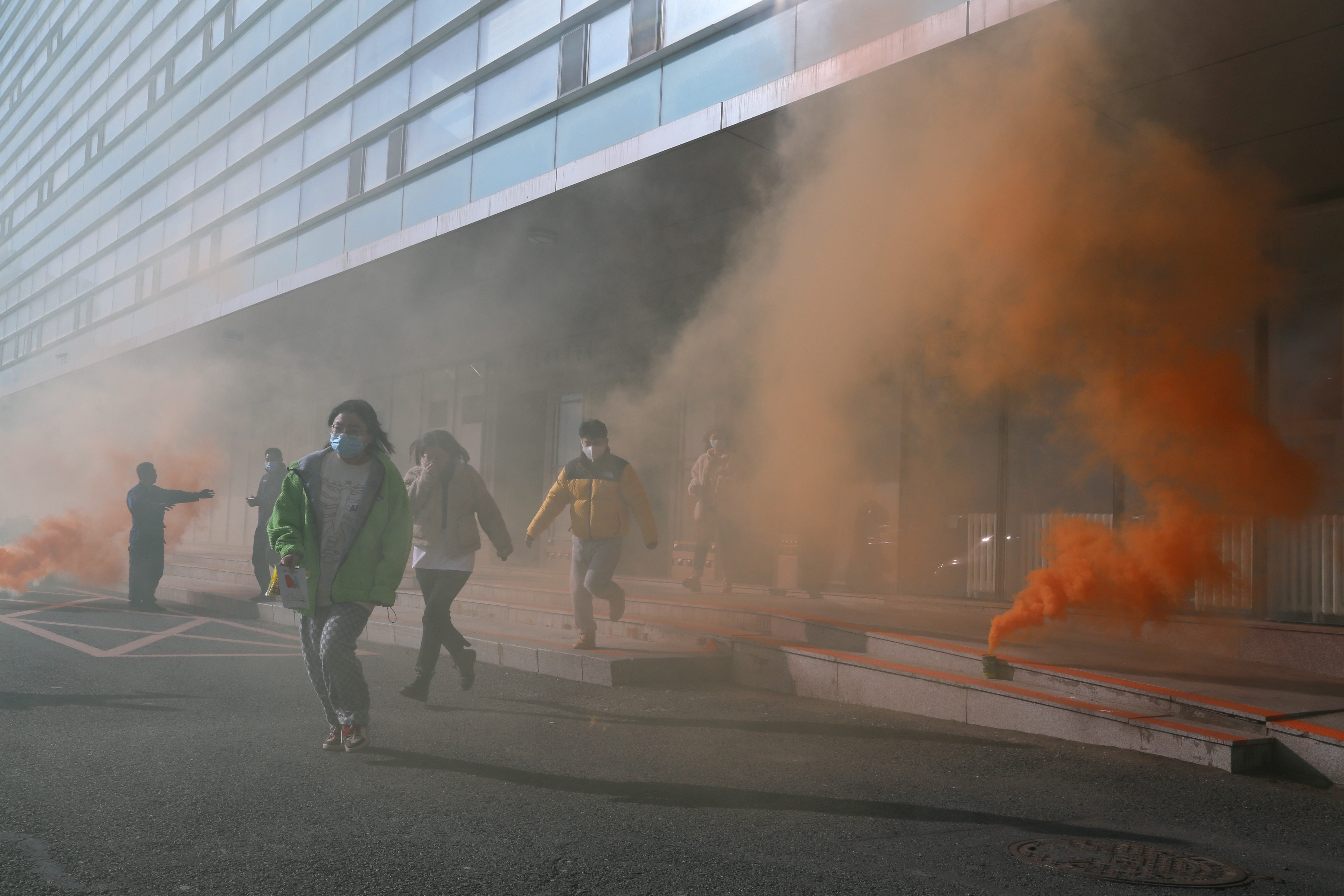 在应急疏散演练环节,演练指挥小组以模拟无机-超分子楼内突发火情为背景,全景演练了突发火情后全楼师生紧急疏散撤离、消防队员灭火等流程,让师生近距离体验并实施了实验室突发火灾的应急预案。