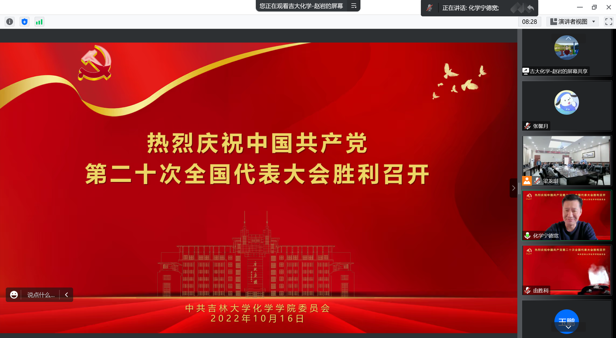 直播结束后,在唐敖庆楼A308会议室线下分会场集中收看的驻校教师和学生党员代表各抒己见,发表感悟,共庆中国共产党第二十次全国代表大会胜利召开!