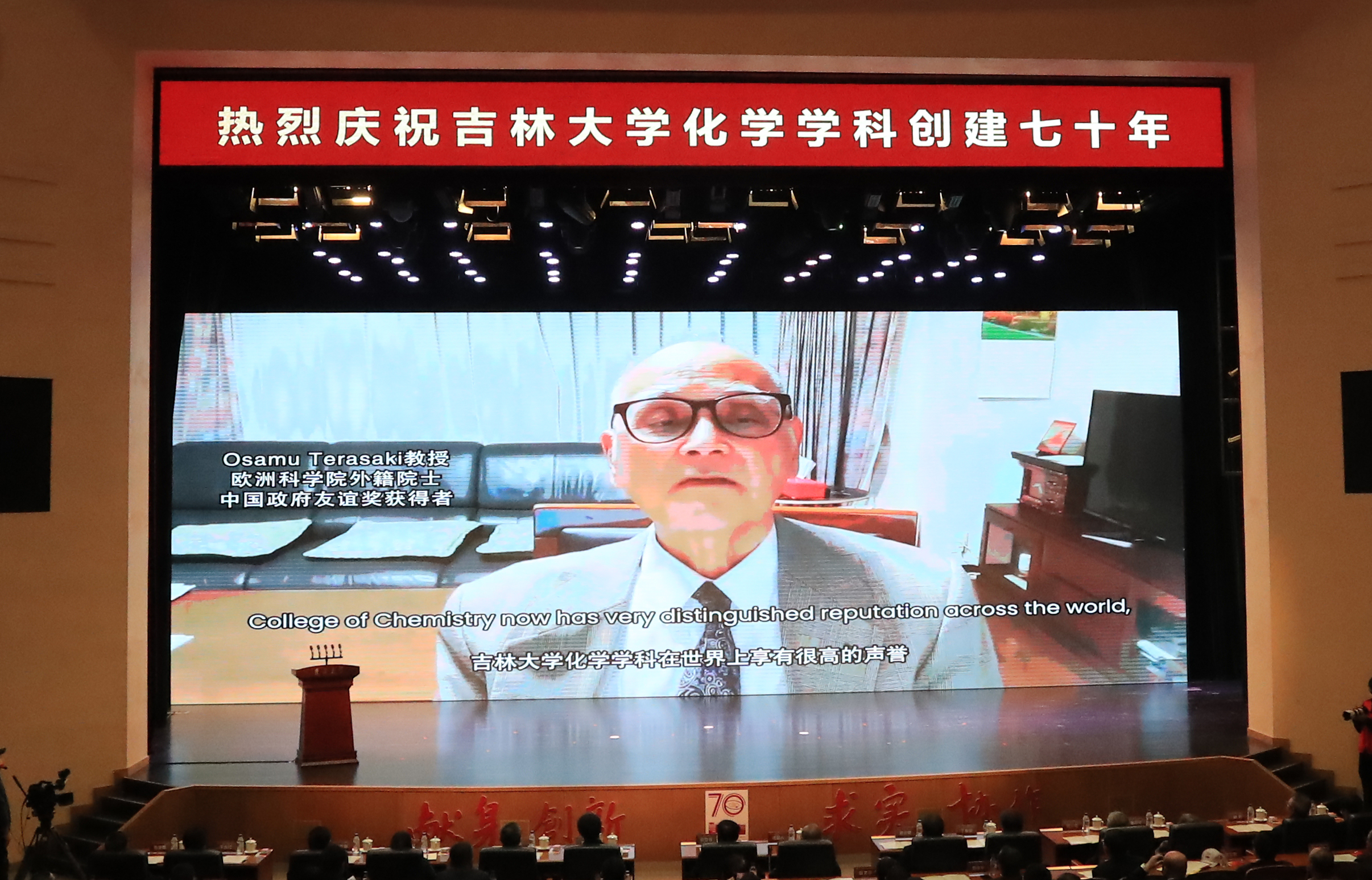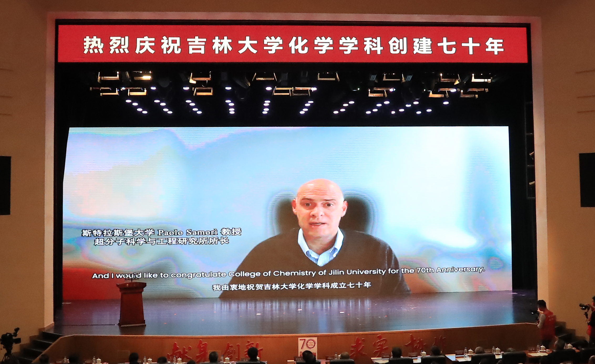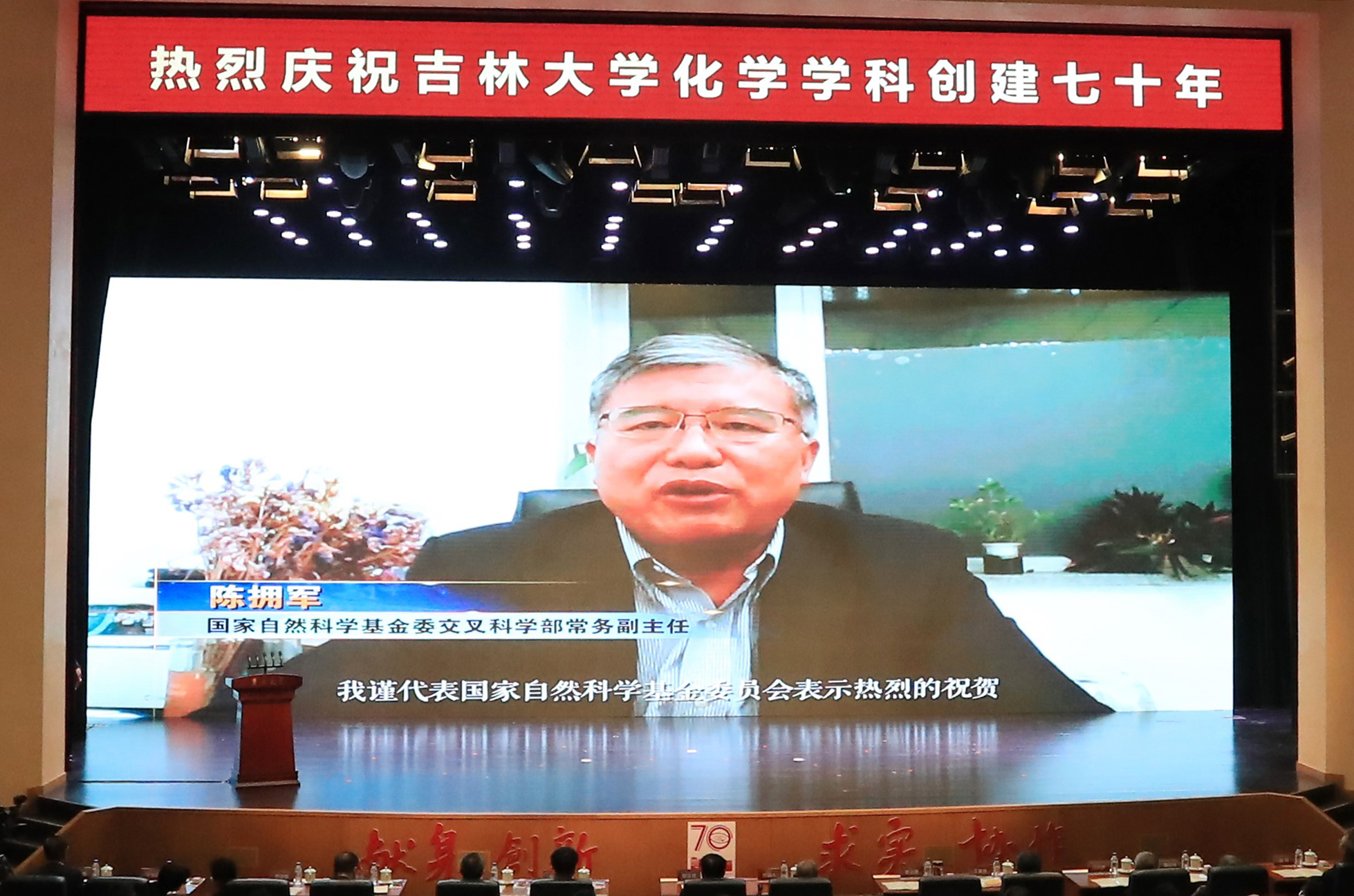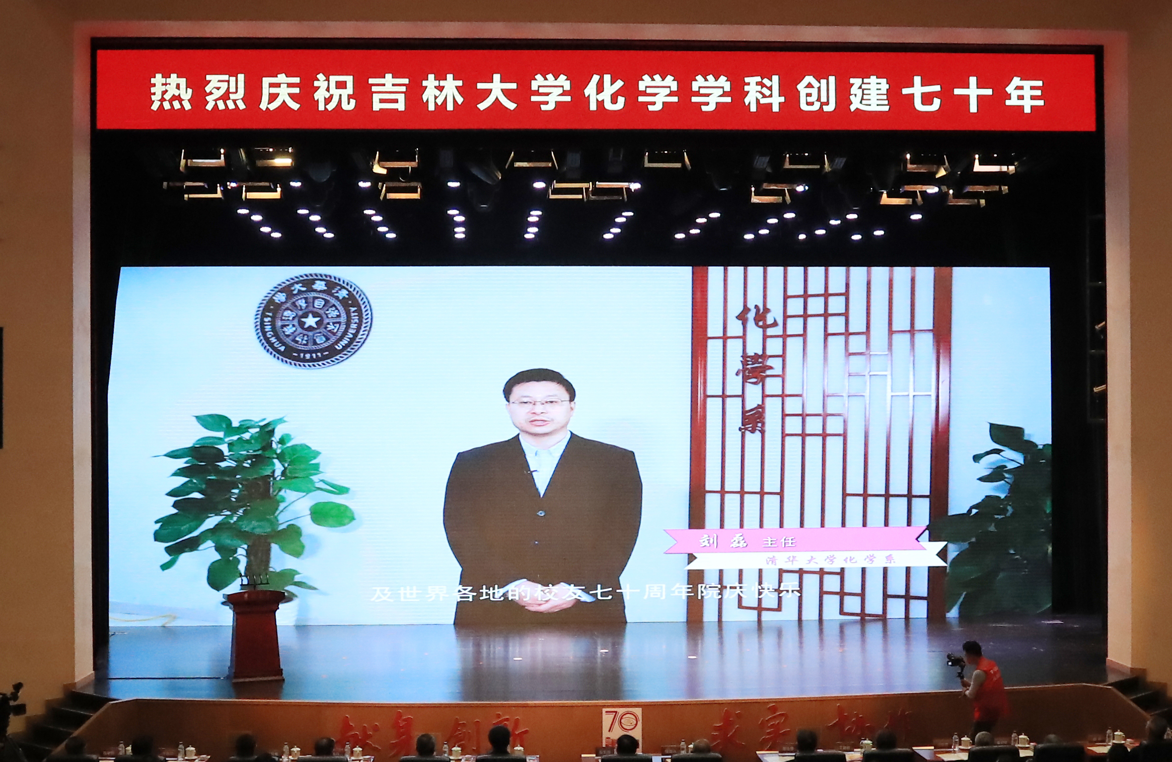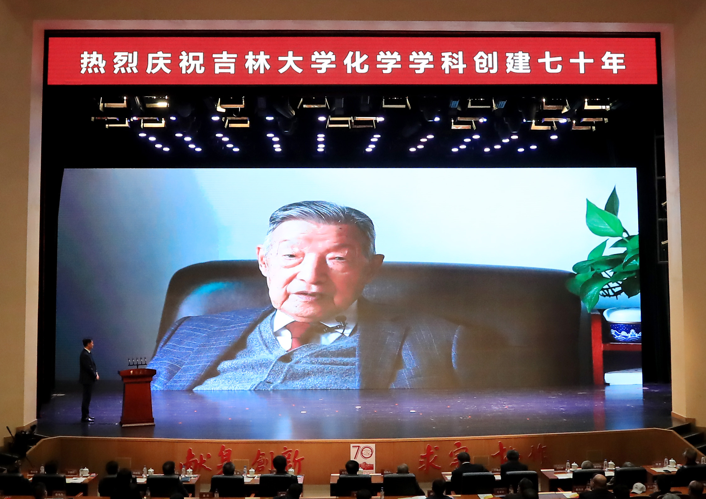 化学学科创建70年专题片、院庆年系列活动掠影以及海内外校友和各地校友会发来的祝贺视频。上午9时30分,庆祝大会在庄严的国歌声中启幕。