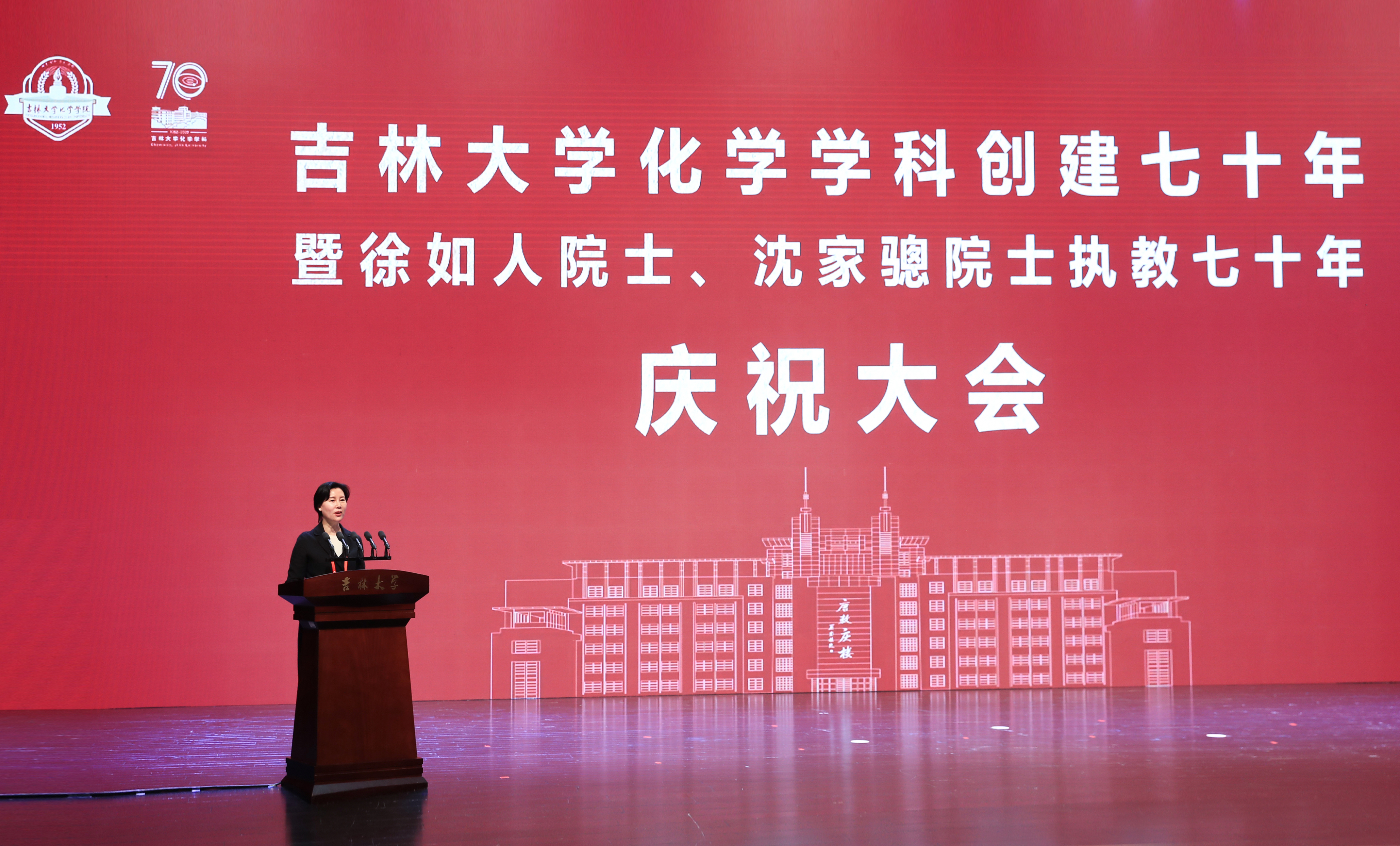 教师发言,向吉大化学七十华诞表示祝贺,向徐如人院士、沈家骢院士致以崇高敬意和诚挚祝福。她表示,吉大化学的发展始终与国家高质量人才培养紧密相连,始终与国家重大需求紧密相连,始终与国际科技前沿紧密相连,始终与服务社会紧密相连,培养了一大批杰出人才,打造了一支堪当科教强国重任的师资队伍。站在新的历史起点上,学院广大教师将坚决扛起深入实施科教兴国战略、人才强国战略、创新驱动发展战略重大职责使命,传承优良传统,紧握接力棒,把化学学科推向新的高峰,在中华民族伟大复兴新征程上谱写新的荣耀与辉煌。