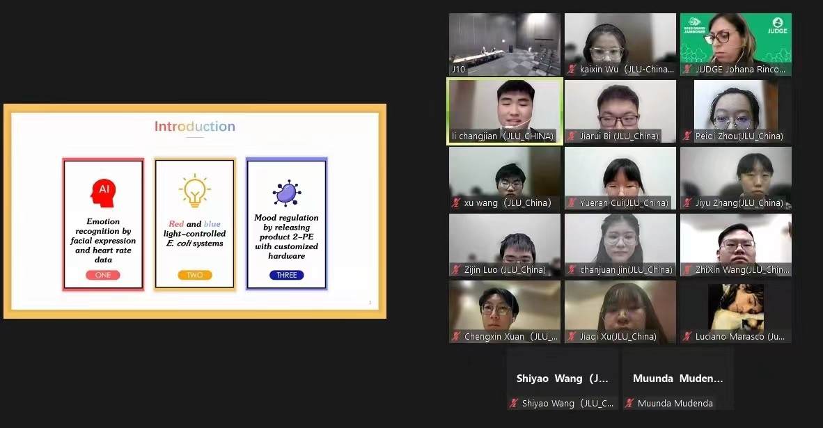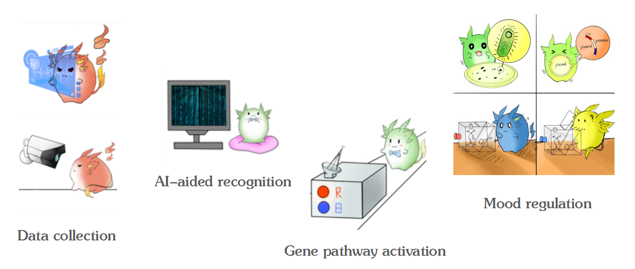 、超分子结构与材料国家重点实验室罗全教授的指导下,以群体负压的社会大背景为出发点,以花香愉悦心情为思维启发点,将AI与合成生物学相结合,搭建了基于面部表情和手环检测相结合的多模态情绪识别系统。将不同情绪转化为相应光信号,诱导工程菌产生相应芳香物质,并通过嗅觉联动实现情绪调节,该系统被命名为“OlfacMood”。此前,团队已和清华大学、北京大学、海南大学等二十余所高校开展交流会,举办了五场教育演讲,全国各省数千名与会者参会。