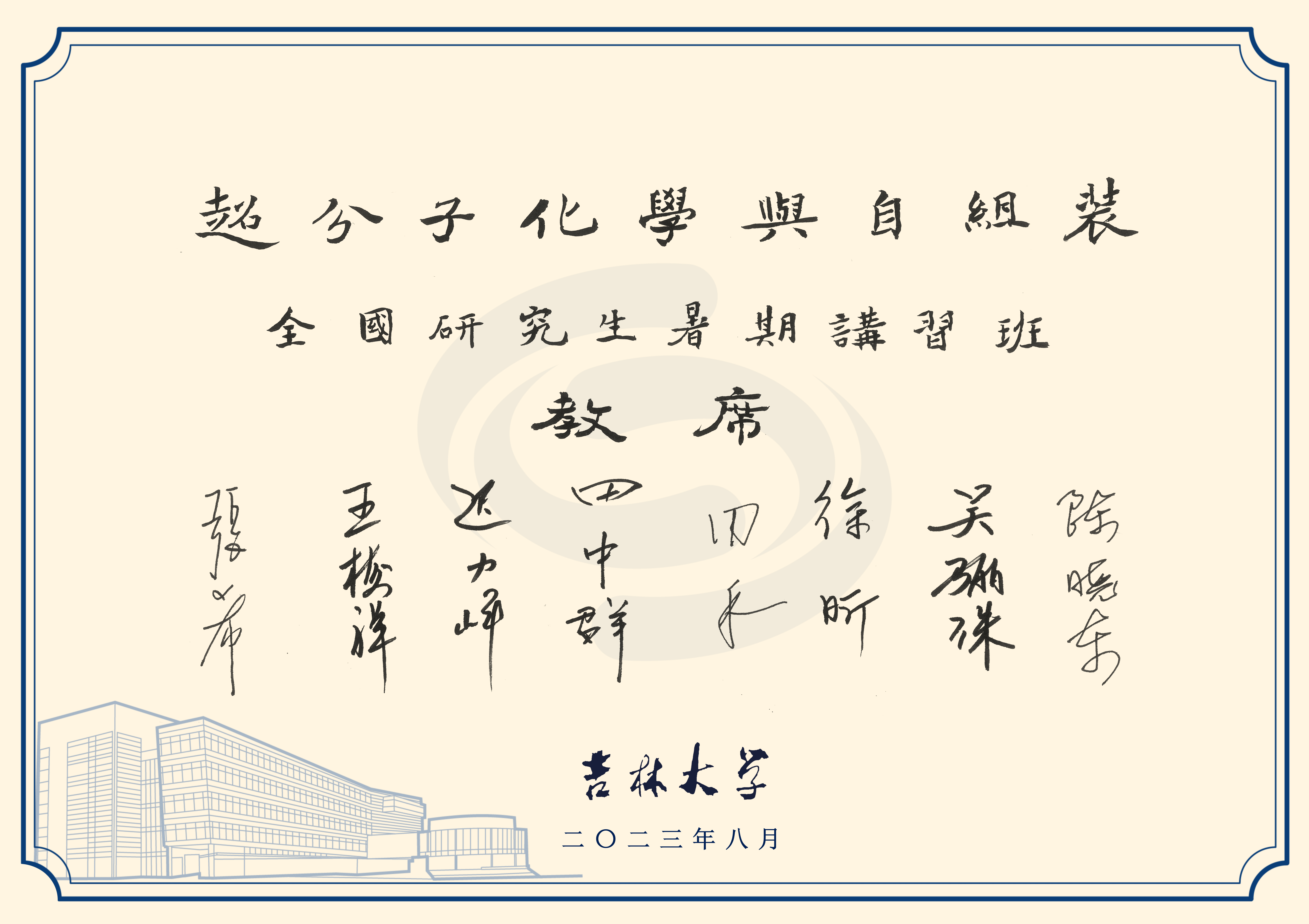 接续传承的教育教学传统,是学校拔尖创新人才培养工作的重要组成部分。唐敖庆、吴式枢等学校先贤秉承“厚基础、重实践、严要求”教学传统,通过举办讲习班为国家培养了一批又一批各专业领域的优秀人才。本次“超分子化学与自组装” 全国研究生暑期讲习班还是东北六校深化人才培养合作的一次有益尝试。未来,学校将进一步总结经验,积极拓展与国内各兄弟高校和科研院所的合作模式,协同推进高质量人才培养,为教育强国、科技强国、人才强国建设贡献力量。
