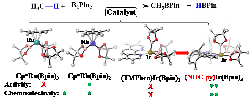 理论化学研究所为第一通讯单位,在J. Am. Chem. Soc上发表了有关机理研究与催化剂精准设计的工作[3]。该工作主要发现了Ru催化的甲烷硼化过程中的两个中间体都包含较强的H…Bpin成键相互作用,它们中Ru的氧化态是一个介于Ru(IV)和Ru(VI)的特殊中间态。在对催化剂的活性和化学选择性深入理解之后,他们进一步提出了一个二者兼顾的配体设计策略,改善铱催化剂的性能:利用具有非对称结构且强供电子能力的氮杂环卡宾-吡啶配体来增强铱配合物对甲烷的催化活性,同时在合适的位置引入特定的位阻基团来压制溶剂分子的反应并提高催化剂对甲烷硼化的化学选择性。通过对13种配体参与的反应进行详细理论计算,预测了可能表现出更高活性且更高化学选择性的相关催化剂结构,实现了对催化剂结构的精准设计(图2)。