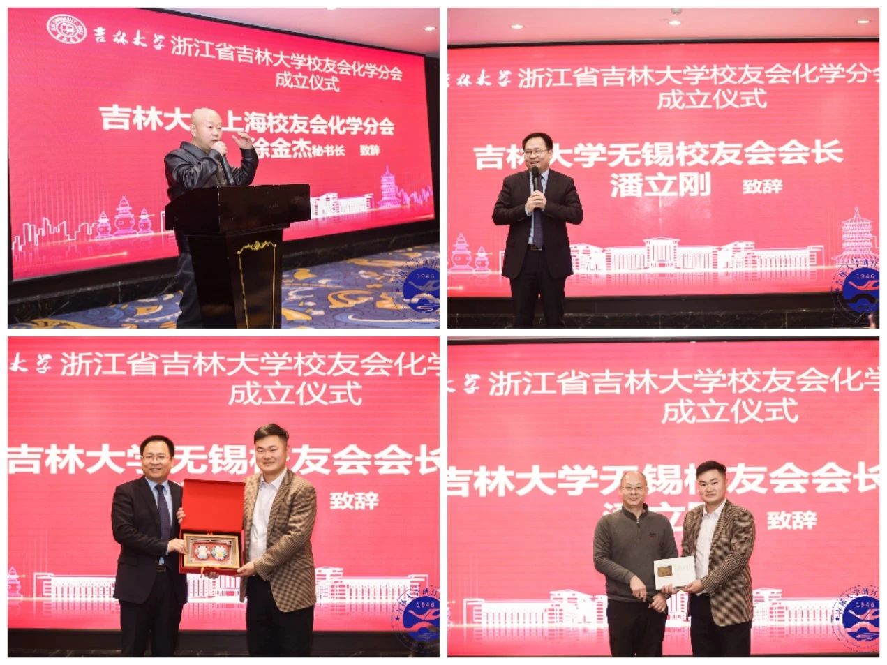 兄弟校友会代表,浙江省北京大学校友会会长陈云峰、辽宁大学浙江校友会会长李欣等在浙知名高校校友会会长,高长有、高明远、牟颖、竺亚斌、苏彬、郑水龙、应子英、商铁存等40余位在浙吉大化学校友齐聚一堂,共同见证成立大会。全球各地吉大化学校友纷纷发来贺信贺电,83级化学校友、杭州师范大学刘俊秋教授,85级化学校友、华南师范大学顾凤龙教授,ACG港湾
