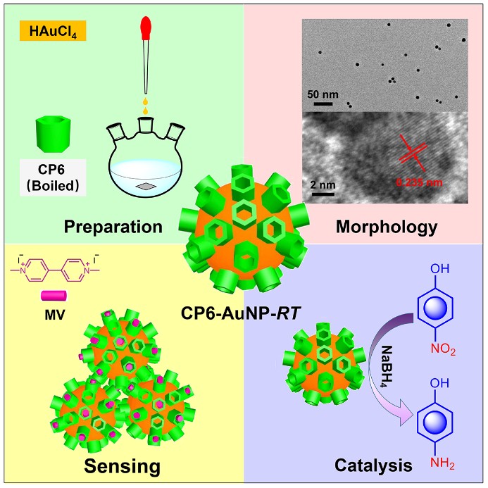 由于球形金纳米粒子的理化性能对其粒径具有很强的依赖性,而目前报道的大环分子功能化金纳米粒子的制备方法中,对于中等粒径的调控仍存在挑战。因此,该课题组基于金纳米粒子的成核和生长环节对环境pH的依赖性,首次用反序Turkevich法,即把氯金酸溶液加入到微沸的水溶性柱[5]芳烃溶液(CP5)中,基于CP5中羧酸根官能团的温和还原性和骨架结构的稳定性,原位一锅法制备出粒径介于强还原剂(如NaBH4)法和经典Turkevich法之间的杂化纳米材料。另一方面,由于水溶性柱[6]芳烃(CP6)与百草枯的主客体作用力比CP5强,所以该课题组同时用反序Turkevich法制备了CP6功能化的球形金纳米粒子(CP6-AuNPs,8.3 ± 0.9 nm)。由于该粒径的金纳米粒子的表面等离子共振信号对于其分散状态的变化十分灵敏,加之柱芳烃功能化后赋予的独特的主客体识别性能,因此,他们首次将吸光度强度比值法和面积积分比值法相结合实现对百草枯的超灵敏检测。相比于该团队发表于JACS的工作(0.2 ~ 3.2 μM),不仅降低了检测限,而且大大拓宽了定量检测的线性范围(0.02 ~ 15.0 μM)。此外,由于CP6的调控和稳定作用赋予金纳米粒子适中的粒径和良好的稳定性,因此,CP6-AuNPs对还原邻/间/对位硝基苯酚具有高效催化活性,并且在循环五次之后,催化活性亦没有明显的降低。