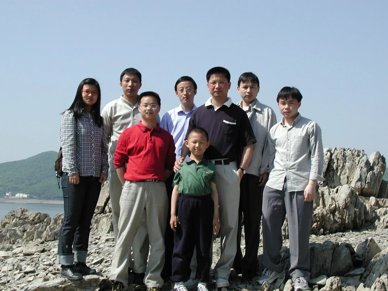 图1 2002年春摄于净月潭 (张希老师课题组单分子力学小分组 后排左起:石味青,王驰,张文科,崔树勋,刘传军。前排左起:许巧兵,张弘一,导师张希教授)