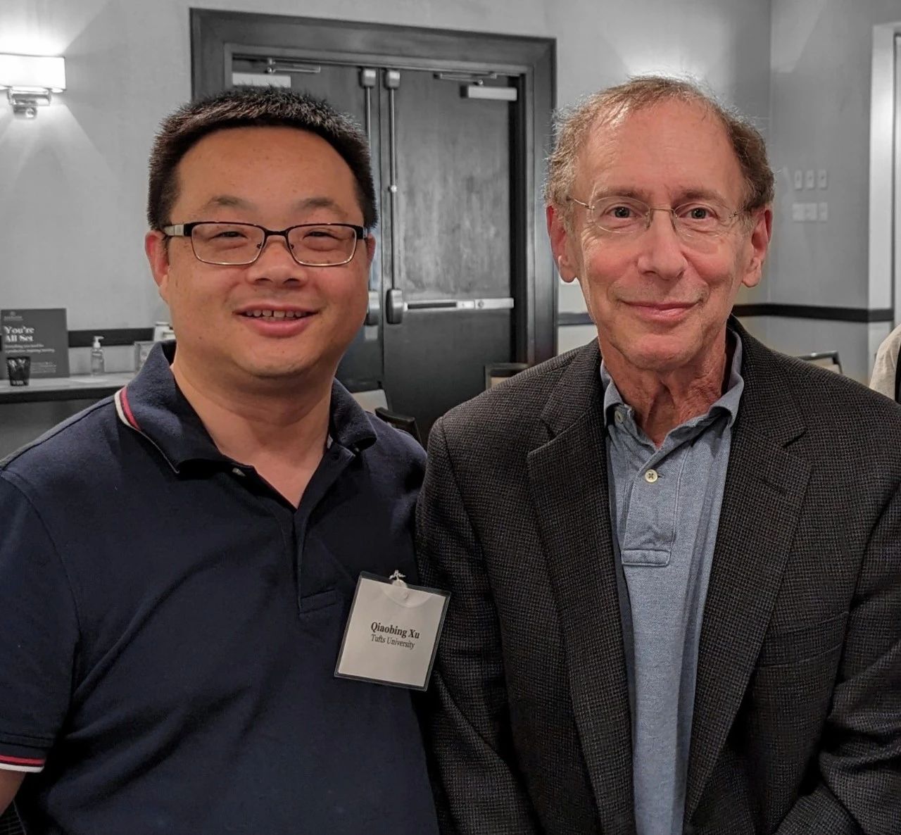图5 2023年6月摄于美国Portsmouth,NH,第14届国际生物医学高分子材料前沿会议。左:许巧兵教授(会议主席之一)和博士后导师Robert Langer教授。