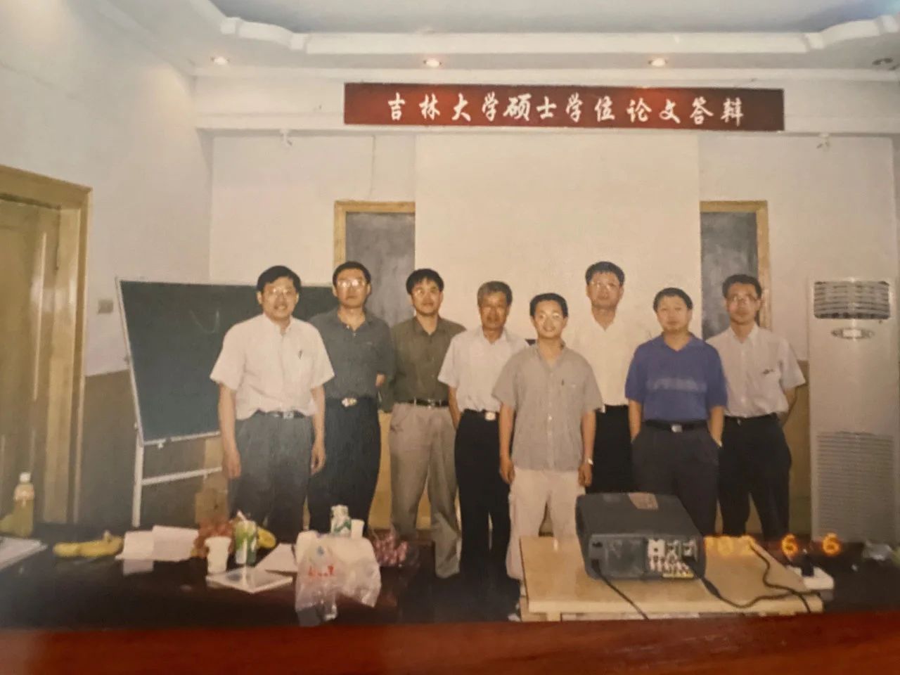 图2 2002年6月6日,通过硕士论文答辩,摄于吉大北区科技楼 (左起:吴立新老师,马於光老师,徐蔚青老师,杨光弟老师,许巧兵,张希老师,王治强老师,王悦老师)