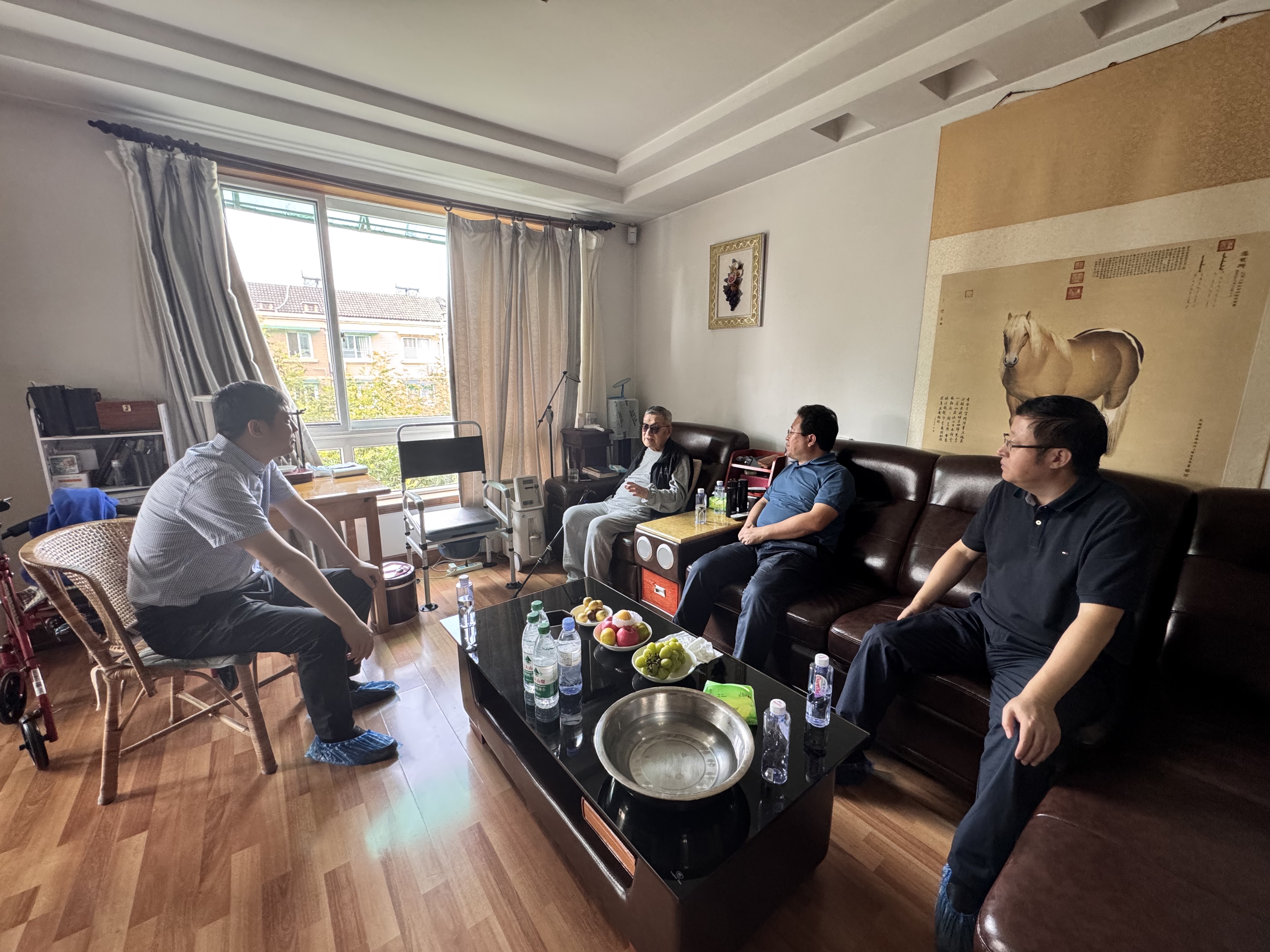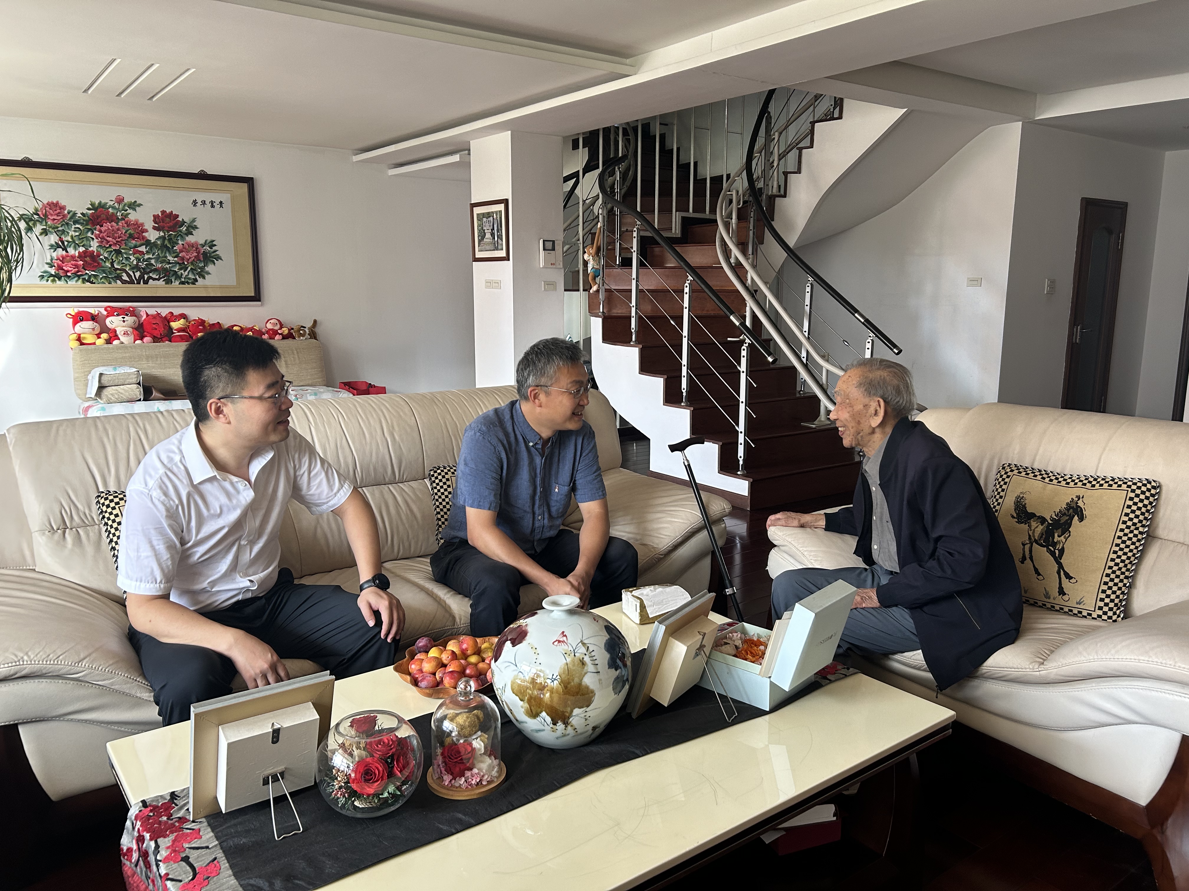 在沈家骢院士家中,马本华亲切询问沈家骢院士的健康、生活等情况,感谢他多年来为超分子结构与材料国家重点实验室建设做出的重大贡献,并认真听取他对实验室建设和研究生培养的建议。沈家骢院士希望学院能够进一步加强国内外的合作交流,开展有组织科研联合攻关、联合培养研究生,切实提升学科的学术影响力。