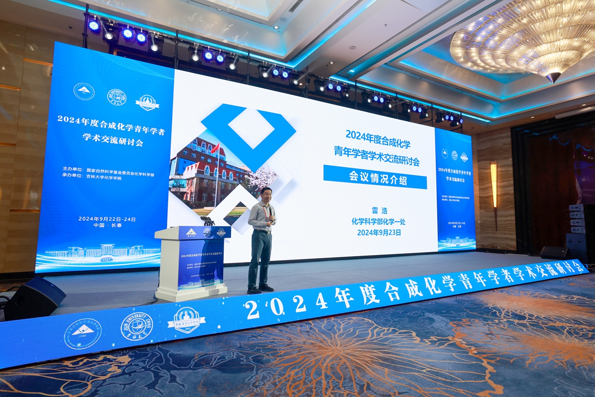 为本次会议的精心组织和筹备表示感谢,并介绍了国家自然科学基金委“合成化学”领域的由来以及合成化学青年学者学术交流研讨会的发展历程等相关情况。他表示,本次研讨会汇聚了指导专家、青年学者等不同的学科群体,以“大会/口头报告、海报/特邀海报”多样化的交流方式开展研讨,其中采用了海报分奇偶场、口头报告随机排序的特殊安排,旨在消融学科壁垒,实现合成化学的高质量发展。