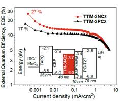 培英计划的支持下,通过与剑桥大学Richard H. Friend教授研究团队合作,以TTM-3NCz、TTM-3PCz掺杂薄膜为发光层制备的OLED最大EQE分别达到27%和17%(如图3所示),其中27%的EQE已接近100%IQE的理论极限值,是目前为止已报道的深红光/近红外光发光二极管(LED)中的最高值。同时,瞬态光谱和理论计算结果表明:器件的发光来自于自由基双线态激子SOMO→HOMO的跃迁。该研究成果是OLED研究领域的重大突破,展现了发光自由基在有机光电领域的应用前景,为OLED的研究开辟了新的方向。