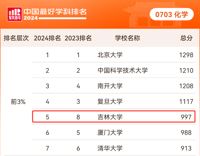 化学学科排名全国第五位,入选“中国顶尖学科”(全国排名前3%或前2名学科)。