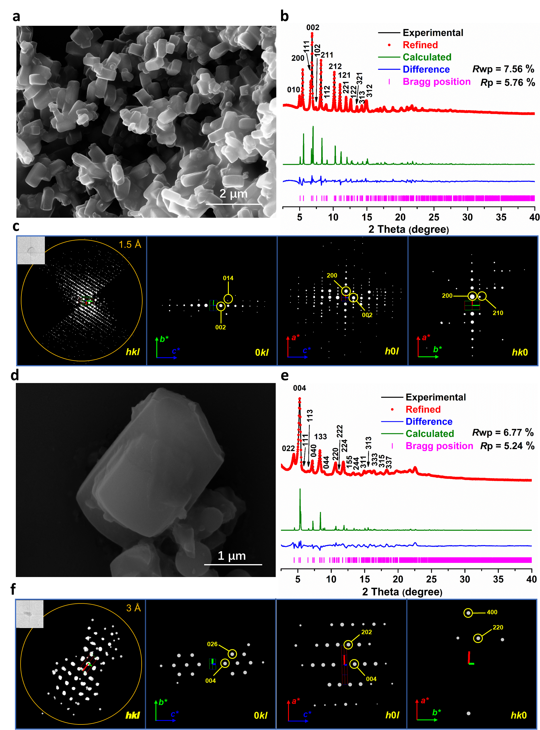 根据PXRD图谱及扫描电子显微镜(SEM)与透射电子显微镜(TEM)图像(图3a,d),JUC-644和JUC-645均表现出较高的结晶度。两种结构主要通过连续旋转电子衍射(cRED)技术进行解析。对于结晶度相对更优的JUC-644,通过cRED数据(图3c)首先确定了JUC-644的晶胞,其空间群为Pcca。这是目前已报道的cRED数据在使用直接法进行晶体结构解析时的最低分辨率。最终的晶体结构模型进行Rietveld精修,Rwp为7.56%,Rp为5.76%(图3b)。高分辨透射电子显微镜(HRTEM)成像对于揭示COF的结构细节至关重要,可提供其原子排列的精准信息。在JUC-645的结构解析中,研究团队结合了cRED技术和HRTEM表征。cRED数据解析确定了JUC-645的晶胞(图3f),其空间群为Fddd。晶体结构模型进行Rietveld精修,Rwp为6.77%,Rp为5.24%(图3e)。HRTEM图像被采集并通过CRISP软件在p1和平面群cmm下进行对称叠加,与双穿插模型沿[1̅10]方向的投影图进行比较,显示出高度一致性,从而进一步验证了结构解析的准确性。根据对JUC-644和JUC-645的拓扑结构分析,JUC-644展示出一种罕见的[6(+2)]-c pcu类似拓扑。JUC-645的拓扑结构类似,但为[6(+2)]-c bsn型拓扑。这种双链结构由相邻构建单元通过多个链接形成,在已报道的3D COF结构中尚属首次发现。由于这些拓扑未在RCSR或TTD数据库中记录,被认为是全新的拓扑结构,并命名为jca和jcd拓扑。这一研究为未来设计具有更多样化拓扑结构的COF提供了新的策略与可能性。