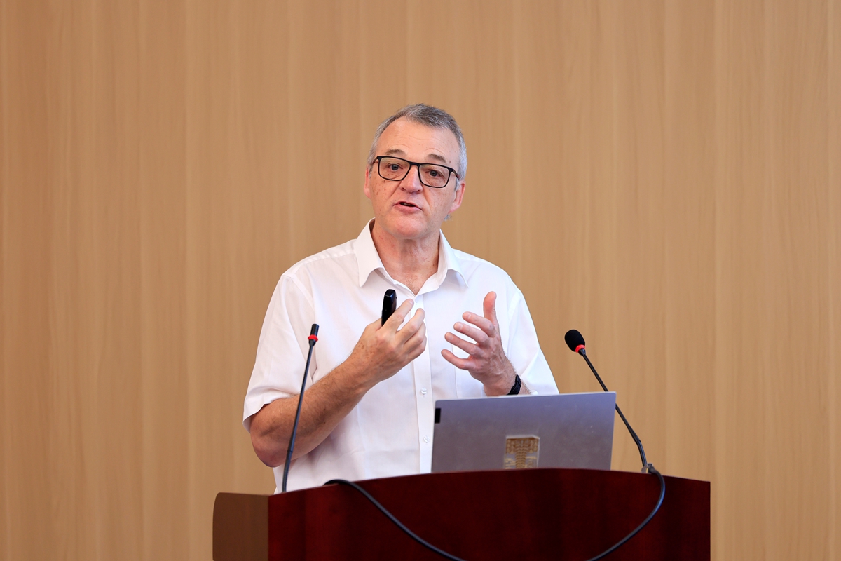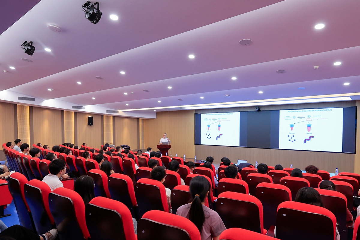 聚合诱导自组装是合成有序高分子组装结构的高效手段,可直接在溶液相中原位制备多种形貌的聚合物纳米粒子,有效规避了传统自组装方法中繁琐的后处理过程。报告中,Armes教授系统阐述了聚合诱导自组装的基本原理,并详细解析了如何通过调控嵌段聚合度、聚合时间等关键参数,精准制备不同形貌与尺寸的组装结构。此外,他还重点介绍了这些纳米粒子在干细胞培养等生物医药领域的应用潜力。在随后的提问环节,Armes教授与在场师生就实验表征细节及领域发展面临的挑战等问题进行了深入交流,其深入浅出的讲解激发了师生对高分子自组装研究的浓厚兴趣与思考。