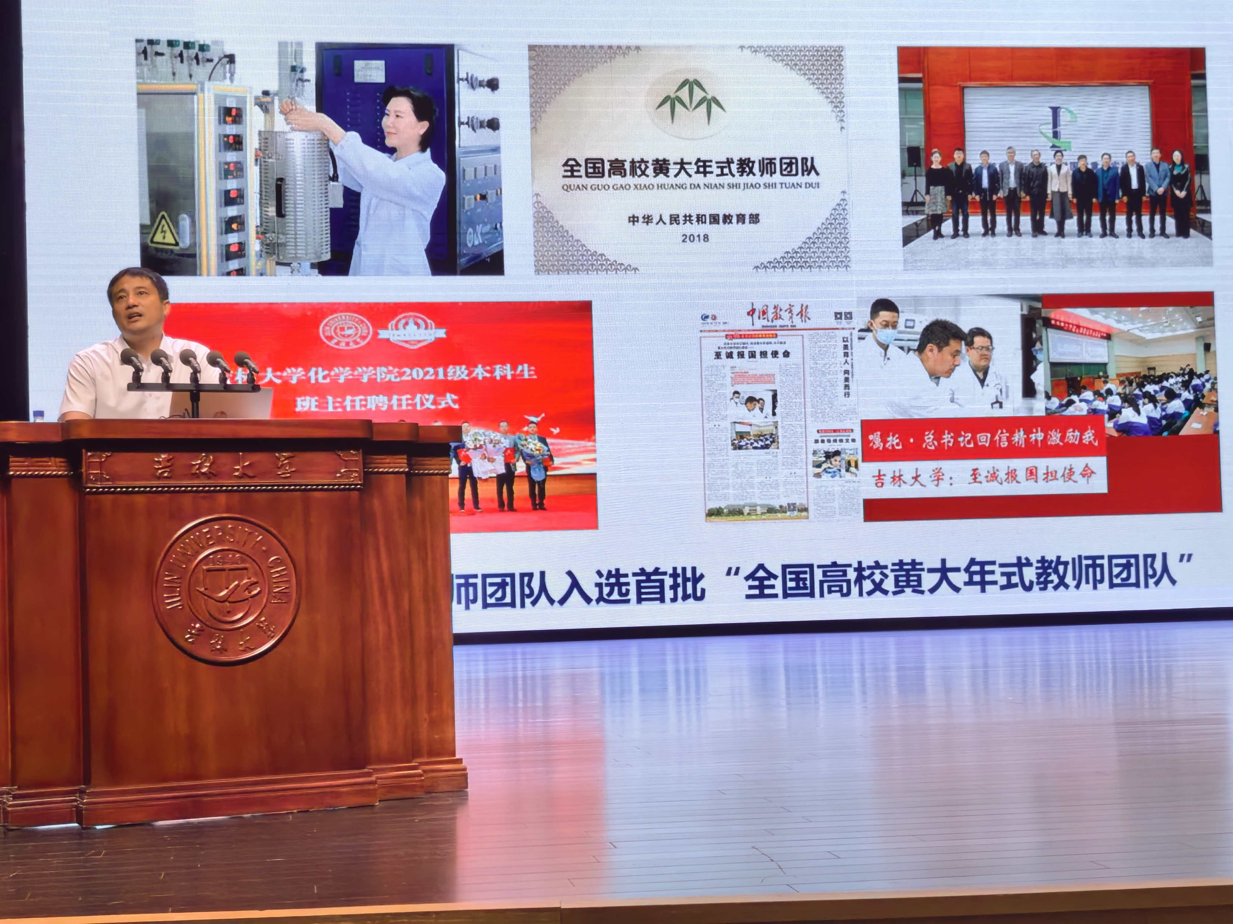 党委书记马本华围绕化学学科现状、化学学科历史、化学学科精神传承三个方面,与同学们一起回顾吉大化学70余年的发展历程。从厚重的历史中共同感悟吉大化学的精神。他鼓励全体研究生新生继承和发扬老一辈吉大化学人“献身、创新、求实、协作”的优良传统,“献身”祖国,瞄准国家重大战略,胸怀家国有担当;勇于“创新”,强化原始创新思维,自立自强有使命;“求实”苦学,扎实学习基础知识,求真务实有作为;善于“协作”,提升交流合作能力,凝心聚力有责任。