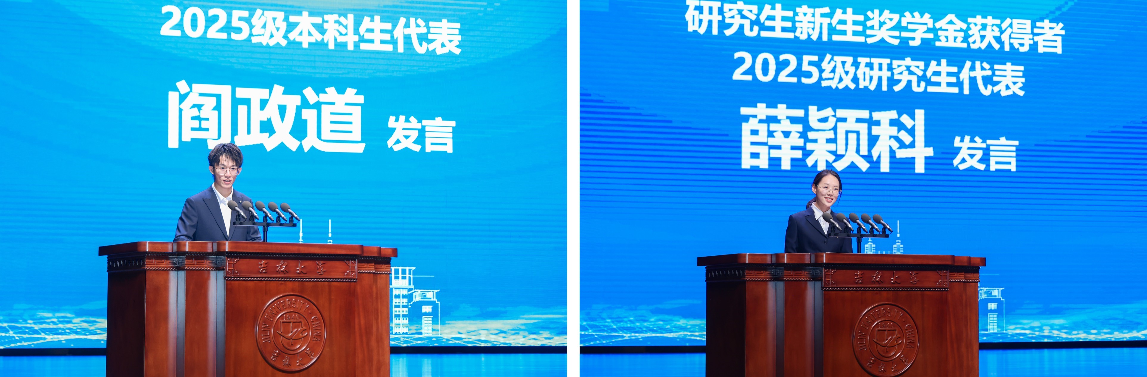 2025级本科生代表阎政道与2025级研究生代表薛颖科先后发言,两位同学表达:将“以元素为基、信念为催化,把青春实验写进科技强国新征程”。
