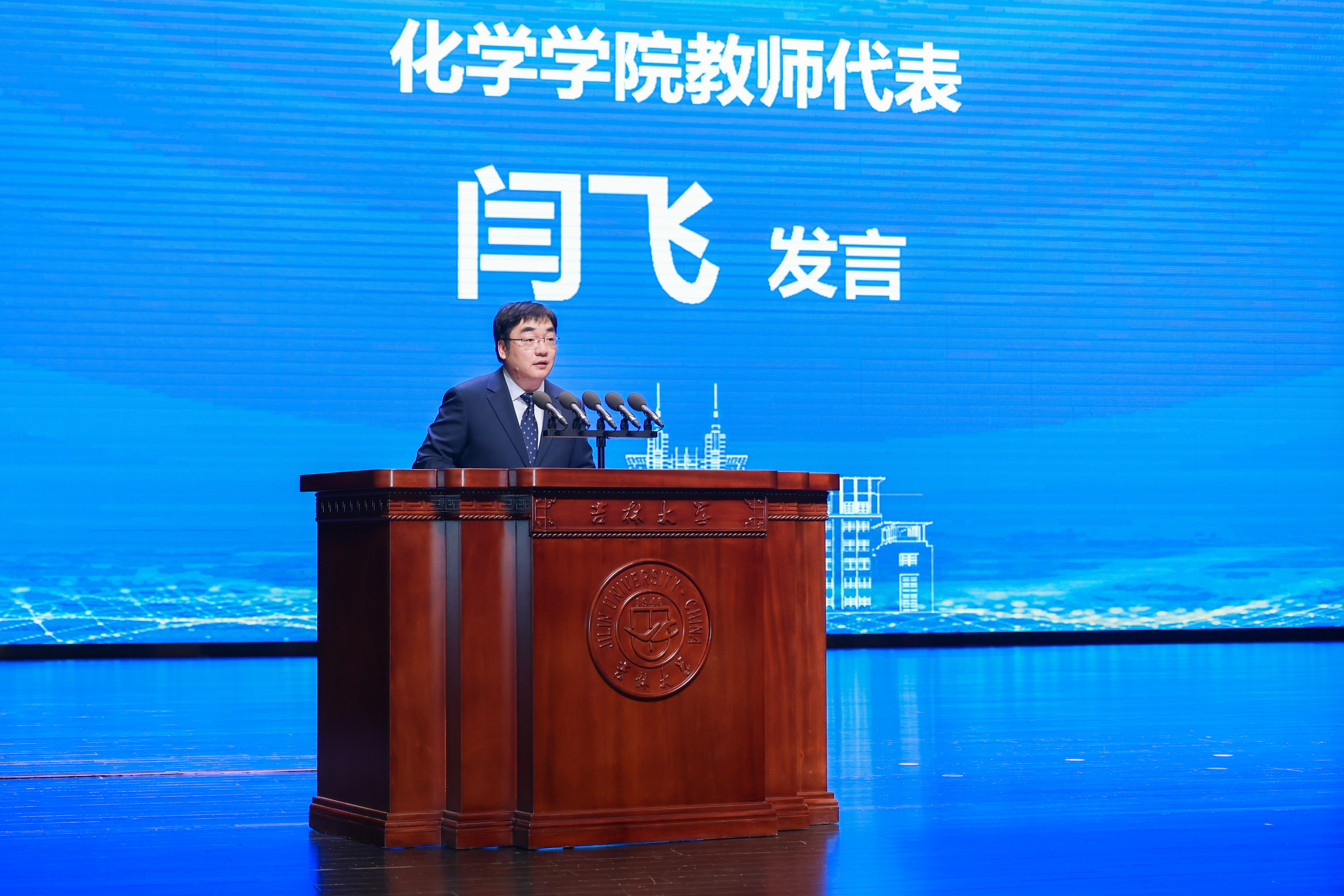 2025级本科生班主任闫飞老师代表学院教师发言,他以化学反应为喻,鼓励2025级新同学要在科研探索的道路上不惧失败、勇攀高峰,在试错与迭代中不断逼近真理,传承好“吉大化学人”的初心使命。