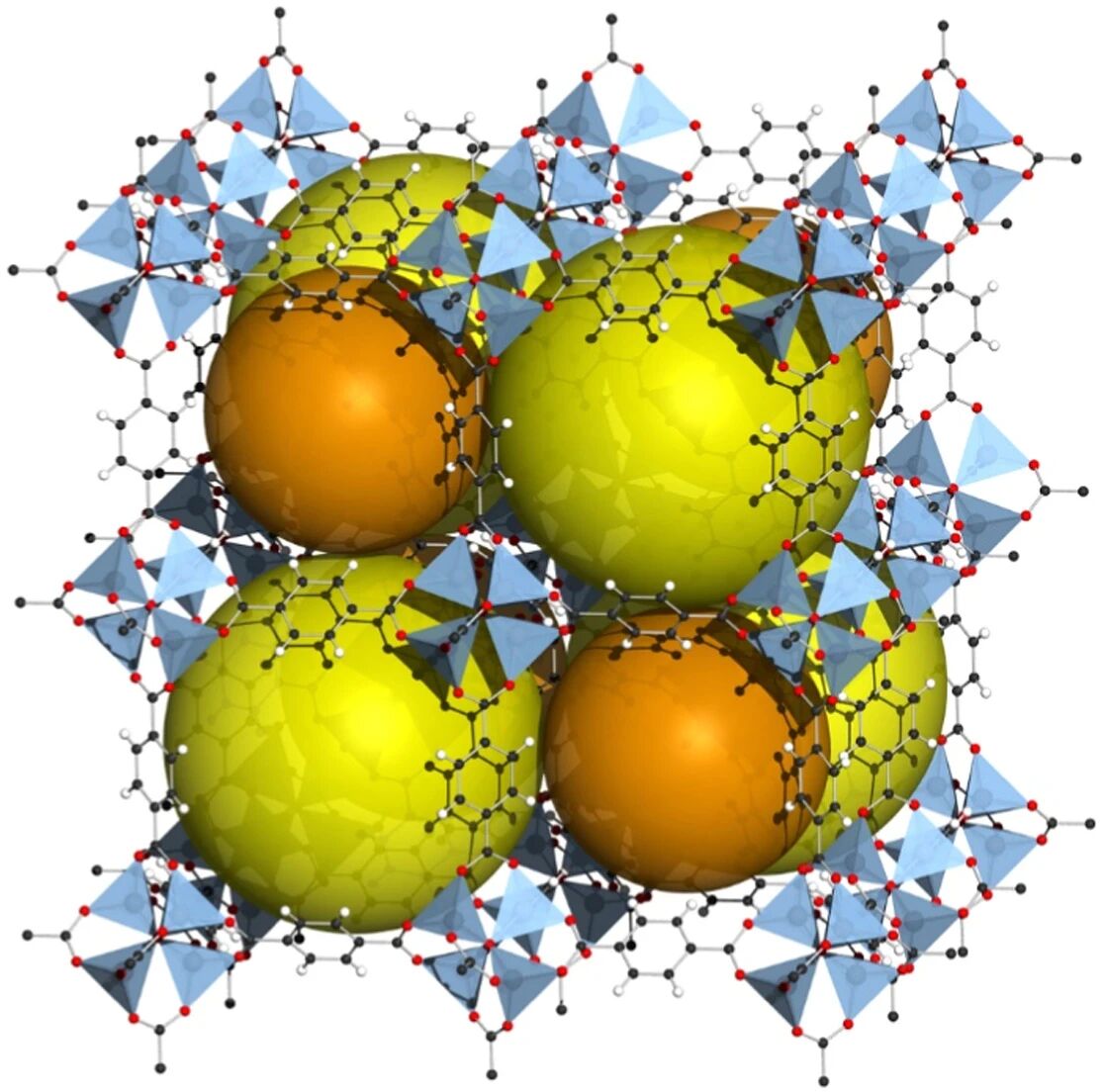 图1.MOF-5的八个晶胞结构,也被称为同构金属有机框架-1(Isoreticular Metal–Organic Framework-1,IRMOF-1)。图中黄色和橙色球体表示结构中的孔隙。 [图片来源:Wikimedia Commons,未经修改。]6