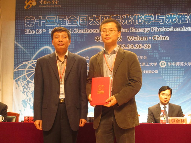 图3 于2012年在武汉举办的第十三届全国太阳能光化学与光催化学术会议期间获颁全国太阳能光化学与光催化研究领域优秀青年奖(首届),并作获奖报告。颁奖嘉宾为中国可再生能源学会光化学专委会时任主任付贤智院士。