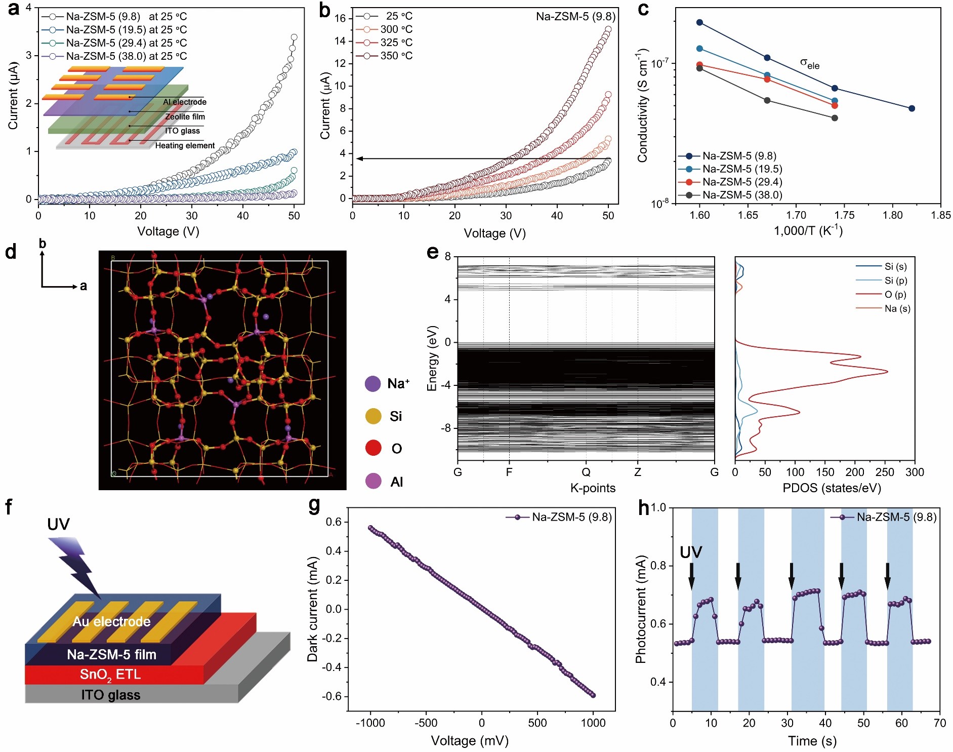图二:Na-ZSM-5分子筛的(a,b)变温I–V测试;(c)变温电导率测试;(d,e)基于第一性原理的电子结构计算;(f–h)光电性质研究