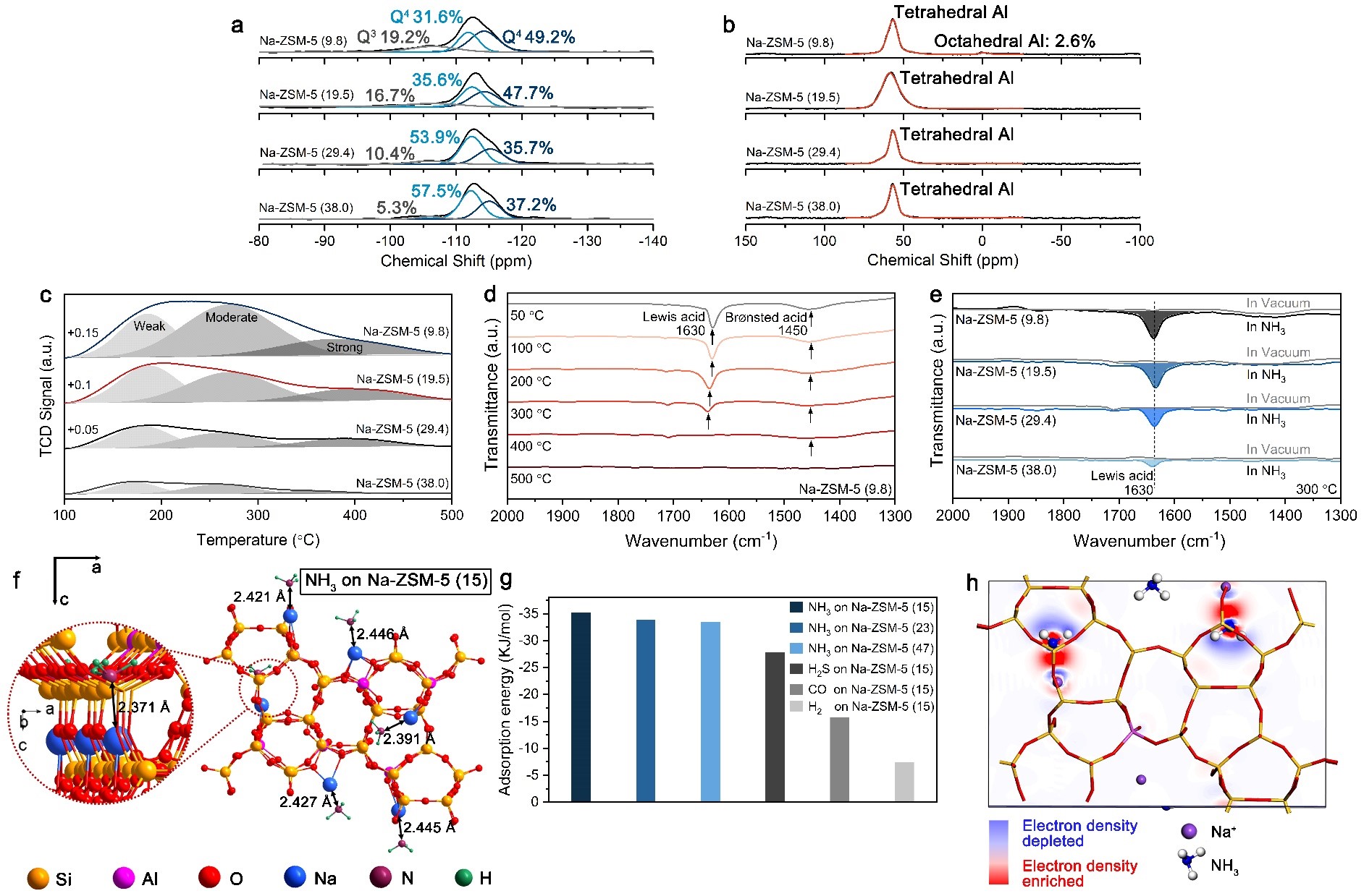 图四:分子筛传感机制研究:(a,b)29Si和27Al固相MAS NMR;(c)NH3-TPD;(d,e)原位FTIR;(f,g)气体分子在分子筛上的吸附能;(h)NH3吸附在Lewis酸性位点差分电荷密度计算