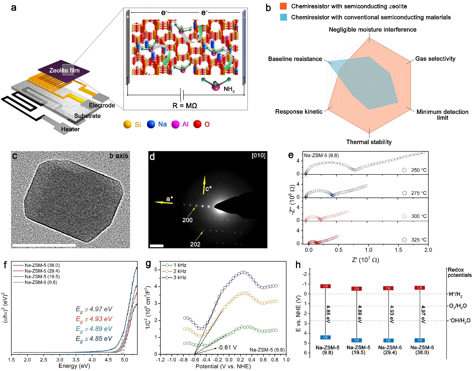 图一:(a,b)导电分子筛基传感器的器件结构示意图及其综合性能对比图;(c,d)Na型MFI分子筛的单晶结构表征,图中标尺分别为50 nm和2 1/nm;Na-ZSM-5分子筛的(e)变温阻抗测试,(f–h)Tauc-plot曲线、Mott-Schottky测试及其能带结构示意图