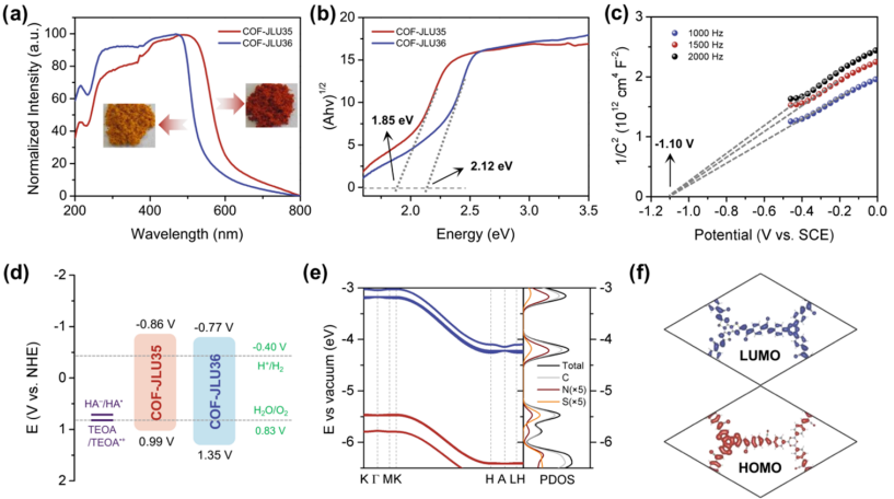 图2:a) TCDA-COFs的吸收谱;b) TCDA-COFs的塔克曲线;c) COF-JLU35的莫特-肖特基曲线;d) TCDA-COFs的能级图;e) COF-JLU35计算的带隙结构和密度态;f) COF-JLU35的HOMO和LUMO轨道。