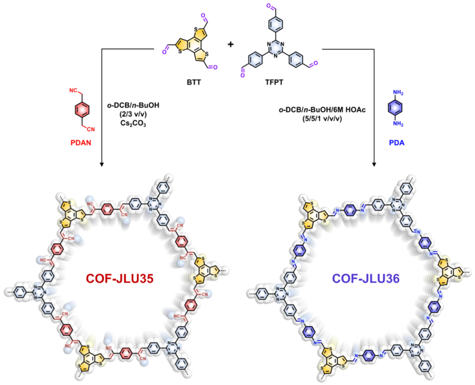 在前期研究工作基础上,刘晓明教授课题组提出构筑多组分二维COFs有效调控材料本征半导体性质、拓宽光吸收范围、增加光生电荷分离效率从而提高材料光解水产氢活性的策略。作为概念的验证,该课题组通过脑文革缩合反应和席夫碱缩合反应将缺电子的三嗪基元(TFPT)和富电子的苯并三噻吩基元(BTT)引入骨架中,成功构筑出了两个光活性三组分电子给体-π-电子受体型骨架(TCDA-COFs)材料(图1)。两个新的COFs材料都具有高的结晶性和大的表面积,其中COF-JLU35的比表面积为869 m2g-1,COF-JLU36的比表面积高达1924 m2g-1。
