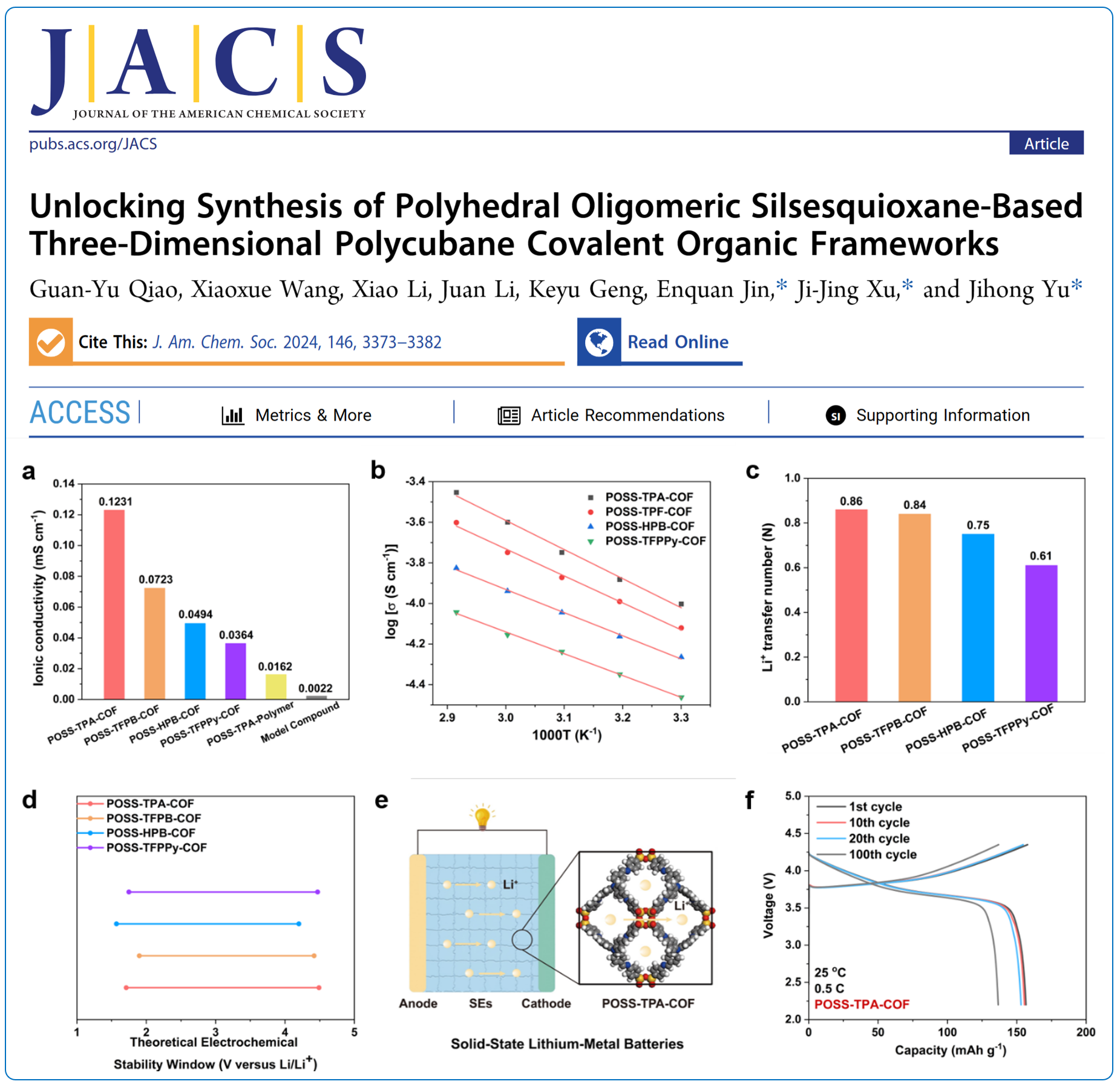 固态锂电池具备能量密度更高、不可燃、不挥发、耐高温等特性,已经成为学术界和产业界争相研发的热点。固态电解质是固态锂电池的核心材料,电解质很大程度上决定了固态锂电池的各项性能参数,如能量密度、安全性能、高低温性能以及循环寿命。目前经典的固态电解质,如氧化物、硫化物、卤化物、聚合物等,由于其稳定性不足还很难满足固态锂电池在实用场景中运行的要求。发展一种兼具高环境适应性和优异电化学性能的新型固体电解质材料是十分迫切的。该工作选择具有Oh对称构型的多面体低聚硅氧烷(POSS)作为构筑单元,设计合成了四种分别具有“the”和scu拓扑结构的新型有机-无机杂化三维(3D)共价有机框架(COFs)。POSS基COFs的杂化网络具有可设计的化学结构和高比表面积,保持了与无机盐的高相容性,丰富的周期性电活性位点,优异的热稳定性以及开放的多层次纳米孔道等优点。基于上述特点,COF材料作为固态电解质在室温下展现出1.23 × 10−4S cm−1的高离子电导率和0.86的锂离子转移数,并具有优异的热稳定性、力学稳定性和电化学稳定性。基于该类固态电解质的锂金属电池在0.5 C和2.2 ~ 4.35 V之间循环时放电容量为133.7 mAh g−1;经过100次充放电循环后,容量保持率为93%。该工作发表在国际权威期刊J. Am. Chem. Soc.2024, 146, 3373−3382上,ACG港湾