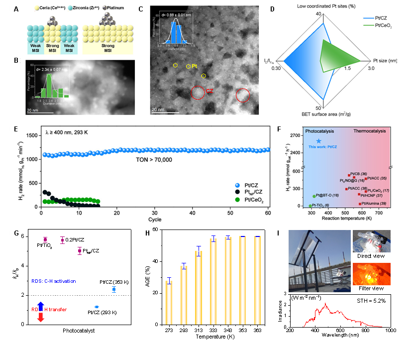 综上,李路教授团队制备了亚纳米Pt团簇负载的铈锆固溶体光催化剂,实现了突破性的环己烷脱氢性能并揭示了高效C-H键活化和快速氢转移的协同效应。通过动态控制光驱动C-H键活化和热驱动H转移的反应决速步骤,实现了反应速率和能量效率的优化。这项研究引入了一种新颖的饱和烃协同脱氢策略,充分利用了自然太阳光谱中可见光(光催化)和红外光(热效应)。该方法初步实现了5.2%的太阳能转化效率,在液体有机氢储存和太阳能转化领域具有重要的应用潜力。