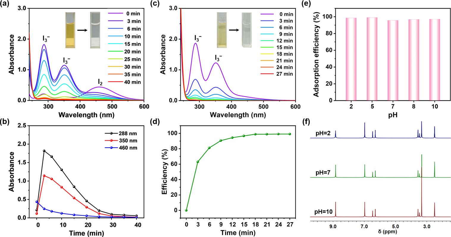 图2.水溶液中碘吸附实验以及不同pH值的缓冲溶液中的碘吸附实验探究。