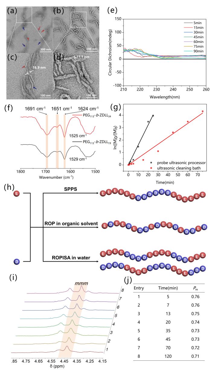 陈学思院士、孙静教授课题组借鉴天然蛋白质可自发形成高度有序多级手性超分子结构,率先提出了在超声辅助条件下,采用大分子引发剂mPEG-NH2引发ε-苄氧羰基-L/D-赖氨酸N-羧基内酸酐(ZLL-NCA/ZDL-NCA)单体在水相中开环聚合诱导自组装(ROPISA),在数分钟内高效制备了多级手性超螺旋结构,进一步诱导等摩尔外消旋单体实现立体选择性聚合,合成了具有较高立构规整度的聚肽高分子。该工作以题为“Fast Catalyst-Free Synthesis of Stereoselective Polypeptides via Hierarchical Chiral Assembly”的文章发表在Journal of the American Chemical Society 上。