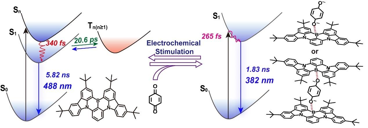 硼掺杂多环芳烃具有色纯度高和发光效率高等优异的光学性能,在发光显示、生物成像、超分子自组装等领域的研究被广泛关注。然而,硼掺杂多环芳烃自身的电氧化还原反应的可逆性差,无法直接应用到电致变色材料中。如何将此类材料应用到电致变色中,仍然缺少有效的策略。近期,张晓安教授课题组与李成龙教授合作研究了电化学响应的可逆B-O 动态配位键, 实现了硼氮掺杂多环芳烃DtBuCzB 光物理性质的动态可逆调节( Nature Communications2024, 15, 5166),探讨了该材料体系在电致荧光变色材料和器件中的应用。本篇工作通过核磁共振、质谱、电化学循环伏安法、瞬态和稳态光谱等实验手段,结合理论计算,证实了电化学响应的B-O 配位和光物理过程切换的机理,构筑了色纯度高,开关时间短的电致荧光变色体系。这项工作不仅加深了人们对硼氮掺杂多环芳烃发光机制的认识,而且为设计具有动态响应性的新型电致变色材料、智能响应材料提供了新的方向。