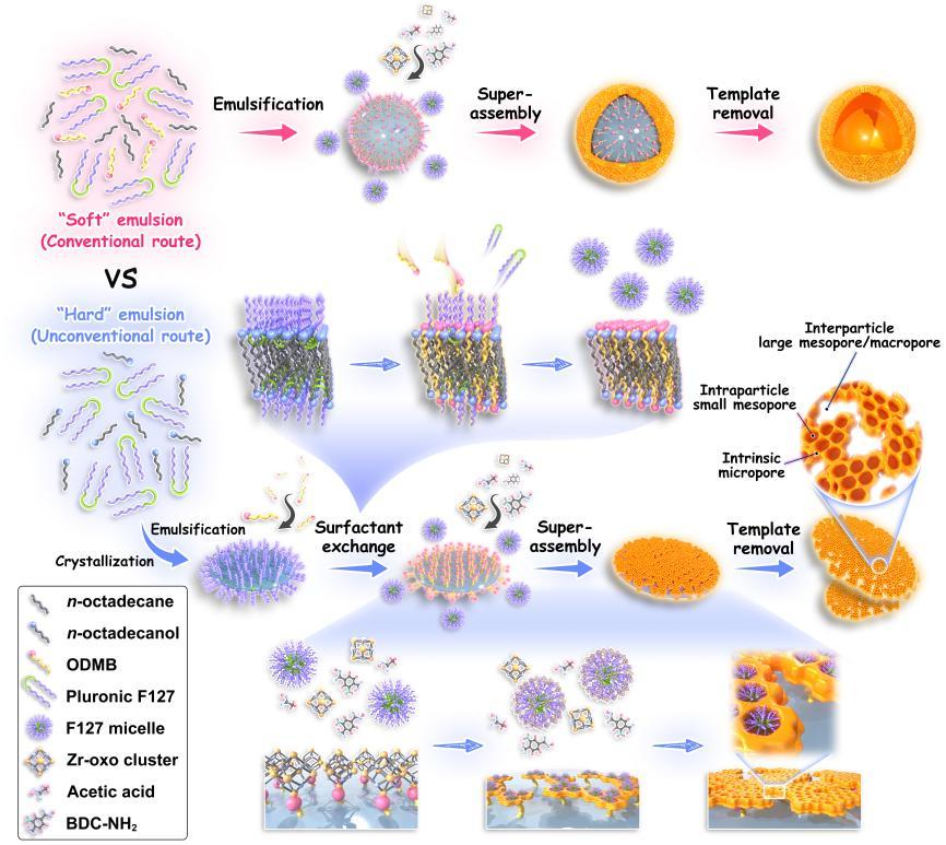 受多级孔材料的启发,将可定制的介孔或大孔引入二维MOF 纳米材料,有望进一步加快传质动力学,暴露出更多的可接触活性位点,进而有效提升其催化活性和整体利用效率。此前,关卜源教授课题组致力于设计和开发全新的多级孔MOF 合成方法学(如孔道诱导各向异性组装,多表面活性剂顺序组装等),实现了对表面活性剂-MOF 前驱体组装过程的精准控制,制备出系列具有不同复杂多级孔结构的MOF材料( J. Am. Chem. Soc. 2023, 145, 16498–16507.; Nat.Commun. 2023, 14, 8062.; ACS Nano 2023, 17, 25061–25069.)。遗憾的是,由于已报道的合成方法存在局限性,且人们对多级孔MOF 材料的形成机制理解不够深入,目前尚难以实现对MOF 材料在特定维度上组装和生长的精确控制。因此,精准地合成具有高度可控的微孔/介孔/大孔的二维多级孔MOF 纳米片仍然是一项巨大的挑战。