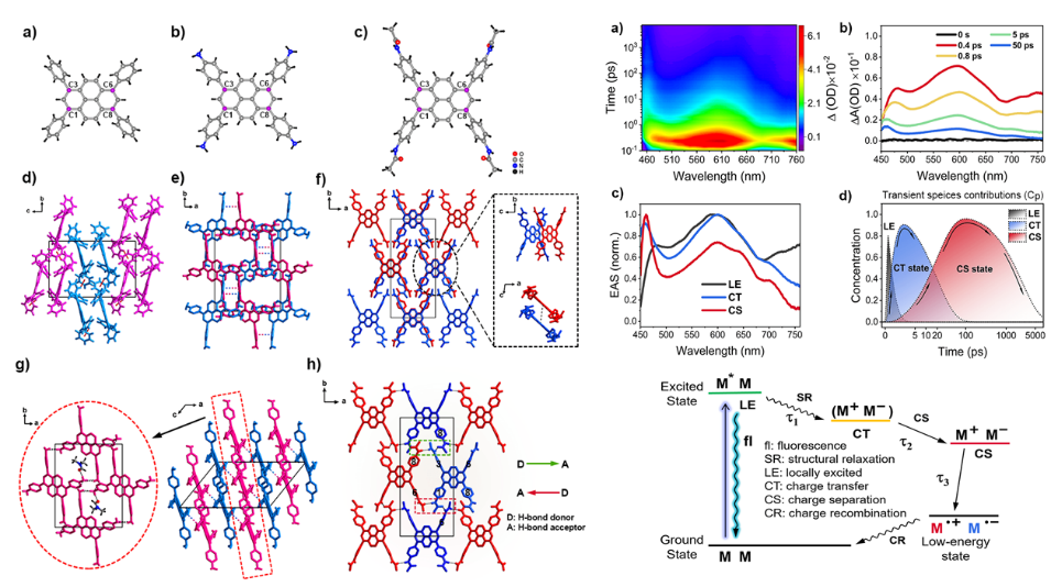 稳态/瞬态荧光光谱和飞秒瞬态吸收(fs-TA)光谱表明三种四苯基芘衍生物(TPPy、Py-TTA和Py-TTAc)可以发生分子间超快电荷转移过程。其中一个分子被激发(M*),然后与另一个处于基态的相同分子(M)相互作用发生电子耦合(M*M),导致分子对称性破坏,受激分子将一个电子转移给位于基态的分子(M+M-),最终两个分子之间发生电荷分离形成自由基离子对(M•+M•-),这个过程被称为对称性破缺电荷分离(SB-CS)。同时,X射线晶体学结果表明较强的(N-H…O)分子间氢键相互作用有助于稳定自由基离子对,进而提升了空气中四苯基芘衍生物自由基的稳定性。