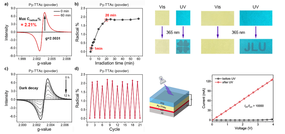 李峰教授和张明教授团队以四苯基芘为研究对象,合成了一类基于平面共轭结构的对称芘衍生物,实现了固态下的快速光响应,并产生了光诱导的稳定自由基。其中,Py-TTAc的光生自由基离子对能够在空气中稳定存在超过12小时,最大自由基浓度可以达到2.21%。
