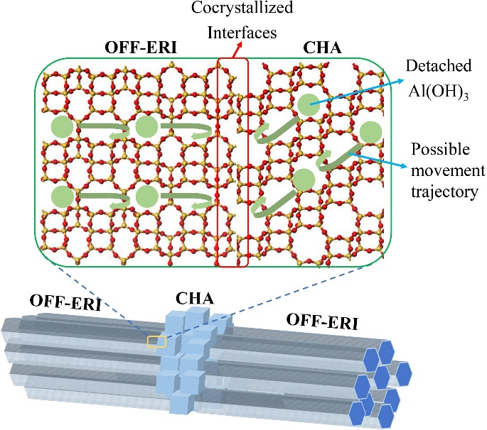 共结晶界面抑制分子筛催化剂水热老化脱铝过程的示意图