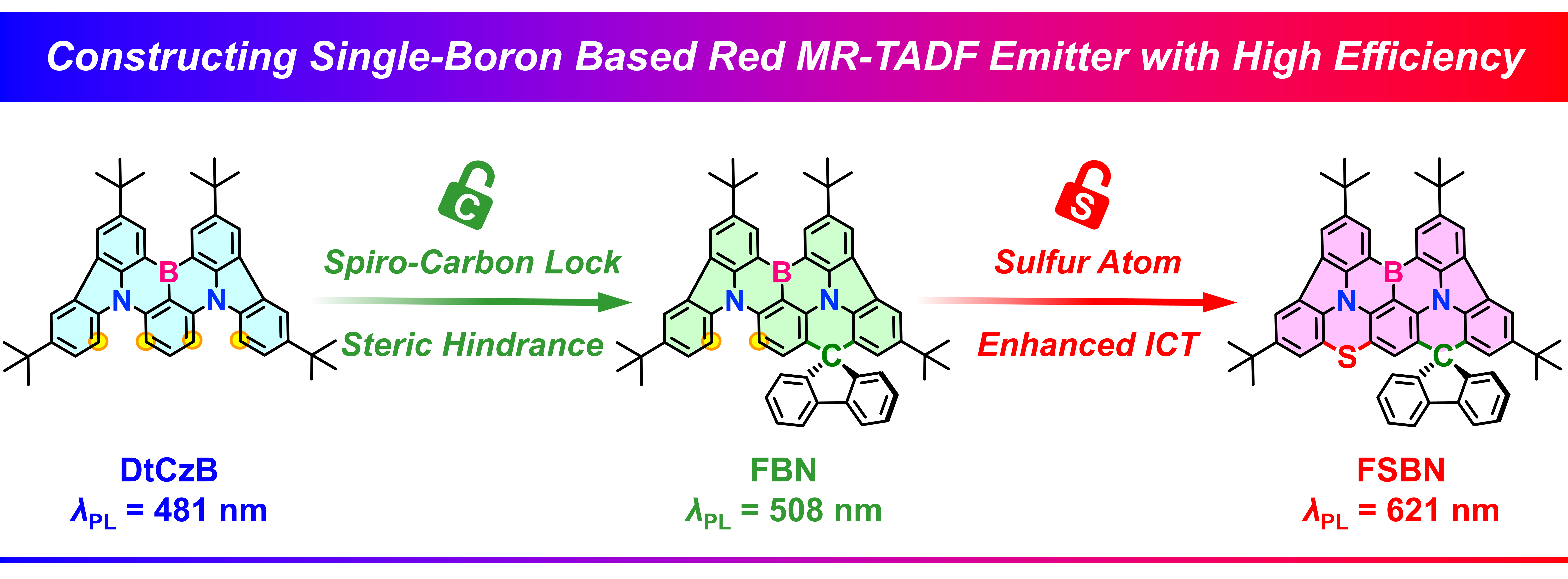 面对新一代宽色域显示技术的迫切需求,开发具备窄带发射红、绿、蓝三原色的发光材料尤为关键。基于硼/氮(B/N)骨架的多重共振热活化延迟荧光(MR-TADF)材料的出现,为发展兼具高效率和窄带发射特性的有机电致发光二极管(OLED)开辟了道路。然而,红光MR-TADF材料的设计策略相对匮乏,这在很大程度上限制了它们在全彩显示中的应用。