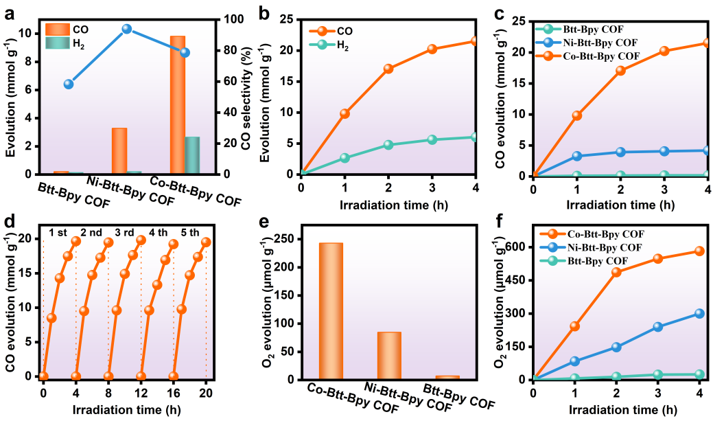 在可见光照射下,我们对双催化位点和优异光物理性质的Co/Ni-Btt-Bpy COF进行了光催化CO2还原和水氧化测试。光催化性能显示,在光敏剂和牺牲及存在时,Co-Btt-Bpy COF在光催化CO2还原和水氧化实验中均具有最高的活性。在CO2还原中,Co-Btt-Bpy COF的CO生成速率达到了惊人的9, 800μmol g-1h-1,选择性达到了78%,分别为Ni-Btt-Bpy和Btt-Bpy COF的5倍和127倍。在水氧化实验中,Co-Btt-Bpy COF的氧气释放速率为242μmol g-1h-1,远高于原始COF材料。并且在五次循环实验共计20小时实验中,催化活性没有明显降低,证明Co-Btt-Bpy COF具有优异的CO2还原和水氧化催化稳定性。此外,我们完成了模拟的完全人工光合作用。在纯水中,不添加任何牺牲电子供体,Co-Btt-Bpy COF的CO产量稳步增加,在4小时内达到7.4μmol g-1h-1(图四)。