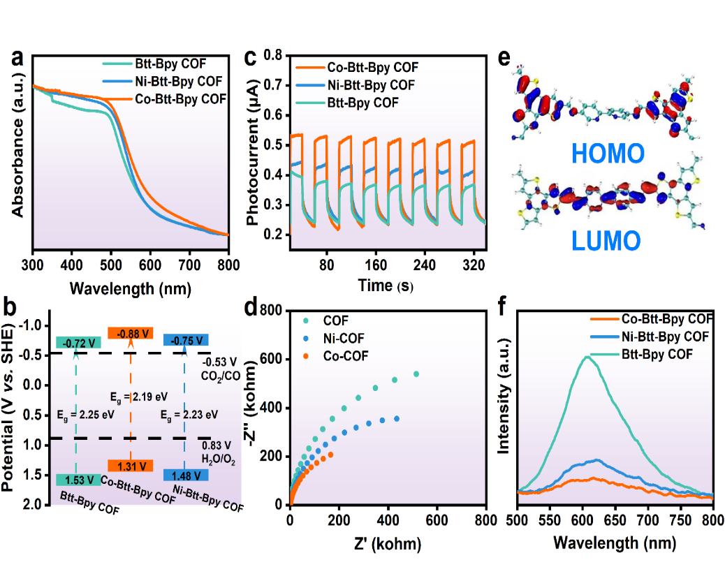 使用紫外-可见漫反射光谱和莫特-肖特基曲线确定了合成COF的能带结构。三种COF都表现出优异的可见光响应,并且均满足光催化CO2还原和水氧化电位。与Btt-Bpy和Ni-Btt-Bpy COF相比,Co-Btt-Bpy COF具有出最大的瞬时光电流密度和最小的电化学阻抗。这证明在光催化过程中,Co-Btt-Bpy COF表现出最小的电子转移阻力和最快的界面电荷传输。此外,Co-Btt-Bpy COF中丰富电子的苯并噻吩部分(HOMO)可将光生电子快速转移到缺电子的联吡啶基团(LUNO)中Co位点。因此,D-A COF 可确保光生电子-空穴对的有效分离并促进分子内电荷转移。这为光催化CO2还原和H2O氧化提供了巨大的潜力(图三)。