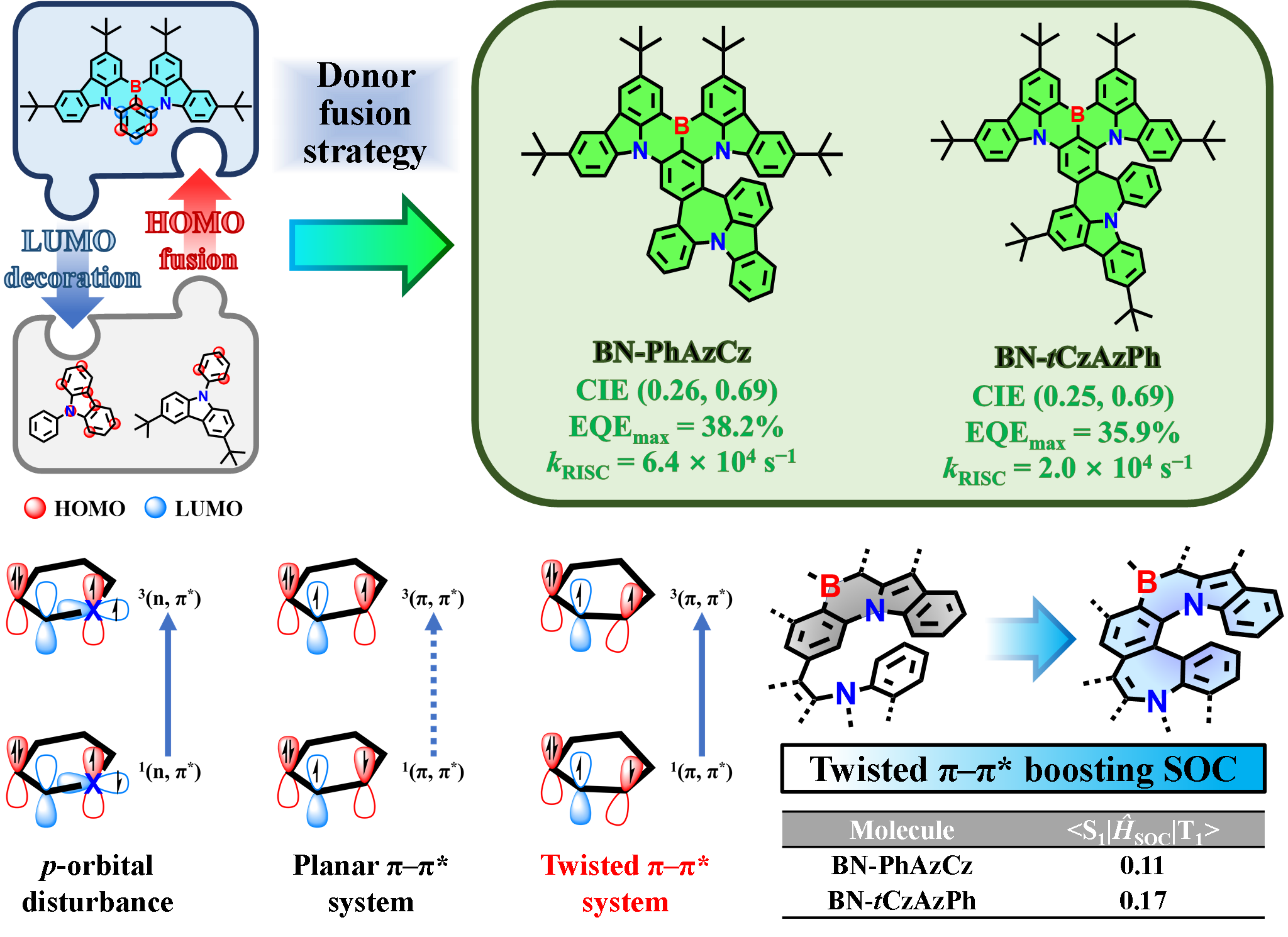 为了解决该问题,王悦课题组进一步提出了给体成环策略:首先通过芳环桥联,在母核分子的LUMO位置引入给体;然后利用给体和母核分子的HOMO位点都具有较高电子云密度的特性,通过Scholl反应将给体“缝合”到母核的HOMO位点上。基于该策略,王悦课题组制备了模型分子BN-PhAzCz,及其类同分异构体分子BN-tCzAzPh,它们的前线分子轨道(FMO)分布都得到了拓展,在甲苯溶液中分别表现出519 nm/521 nm的正绿光发射和37 nm/44 nm的窄半峰宽。在单主体电致发光器件中分别表现出528 nm/524 nm的正绿光发射,(0.26, 0.69)/(0.25, 0.69)的CIE色坐标,以及38.2%/35.9%的最大外量子效率。同时偶然发现,分子具有高度扭曲的杂[6]螺烯骨架,由此引入的π–π*跃迁能够显著增强自旋-轨道耦合作用,加速三线态激发态的反向系间窜跃过程。以分子BN-PhAzCz为例,其反向系间窜跃速率可达到6.4×104s−1,在1000cd/m2亮度下仅有28.0%的效率滚降。文章中还进一步从理论计算和光物理动力学的角度讨论了分子BN-PhAzCz和BN-tCzAzPh这两个类同分异构体之间的结构-激发态关系。王悦课题组提出的这种给体成环合成策略同时具有合成简单,产率高,可大量制备等优点,为MR材料的官能修饰和光色调控提供了启发式方案,有望能进一步扩展满足超高清显示要求的MR-TADF分子库。相关成果发表在Angew. Chem. Int. Ed.杂志上。(Angew. Chem. Int. Ed.2025, e202506201)