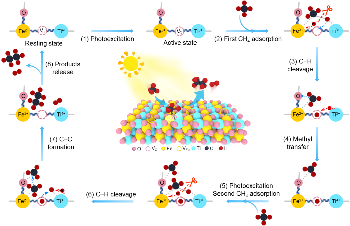 李路教授和中国科学院长春应用化学研究所宋术岩研究员团队提出了一种创新性的催化剂设计策略:在具有高活性{012}晶面的缺陷钛铁矿(Fe1-xTiO3-x-NS)上构筑受阻Fe2+–□–Ti4+双金属位点。该双金属位点与相邻晶格氧协同作用,使催化体系在无氧条件下实现了高效且选择性的光催化甲烷转化,对C2+产物的选择性接近100%,并表现出优异的循环稳定性与出色的抗积碳能力。值得强调的是,该体系的催化性能已超越当前文献报道的金属氧化物及贵金属基光催化剂,展现出优异的应用潜力。机理研究揭示,催化剂的价带主要由Fe离子占据,光生空穴富集在Fe位点;导带则主要由Ti离子占据,能够有效地接收光生电子。光照下,受阻Fe2+–□–Ti4+位点可被激发形成具有长寿命的Fe3+–□–Ti3+活性态,而表面晶格氧在多步反应中起到稳定反应中间体的关键作用。这种协同效应显著降低了C–H键的活化能,优化了甲基迁移与偶联路径,降低了C–C键生成能垒,并有效抑制了甲基中间体的过度脱氢。该双金属–氧协同策略成功打破了传统催化体系中活性与选择性之间的权衡,实现了卓越的催化性能与选择性协同提升。