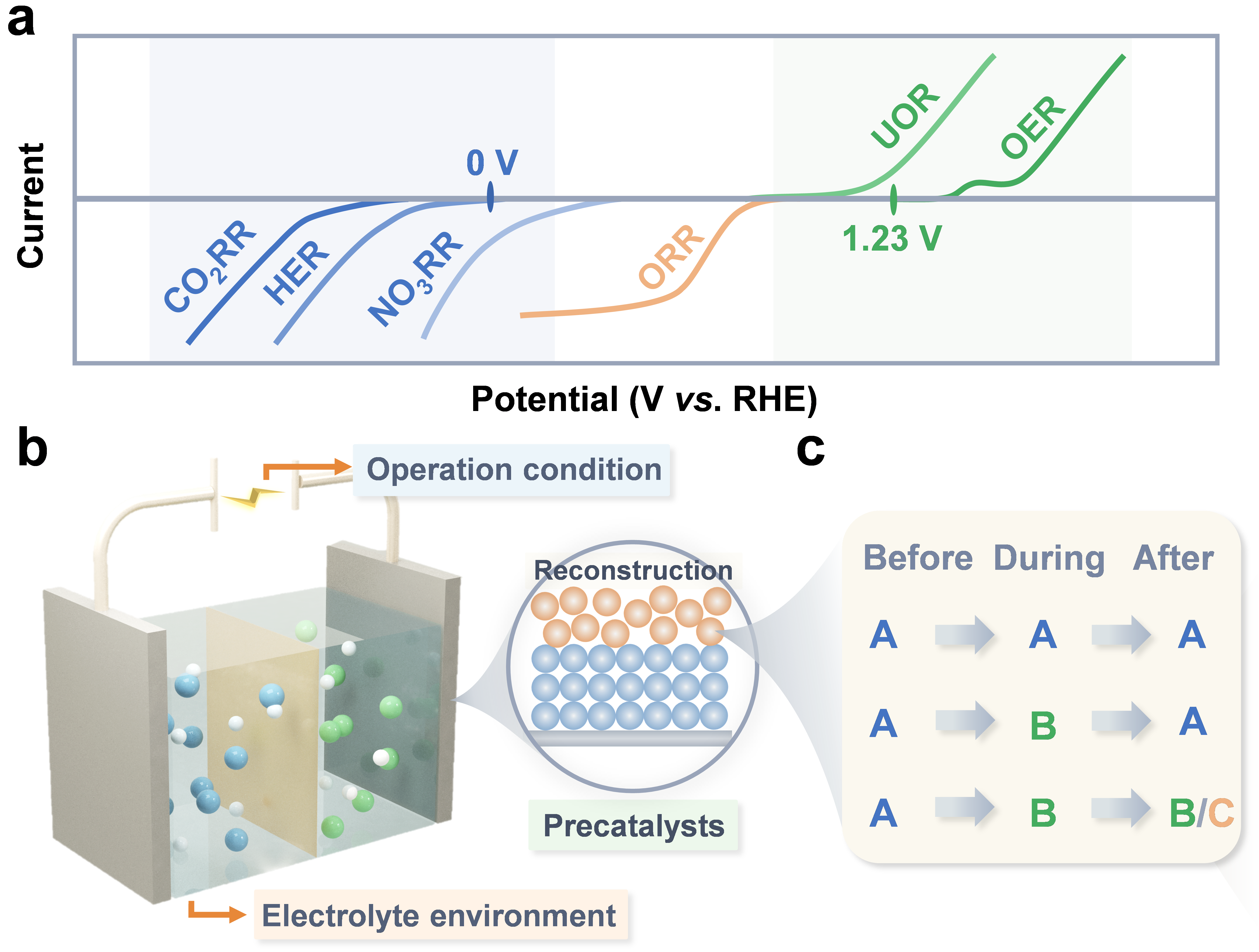图1电催化反应及电催化剂重构。
